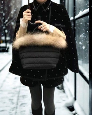 ふわふわファーとキルティング素材の異素材ミックスが上品な印象のバケットバッグ。