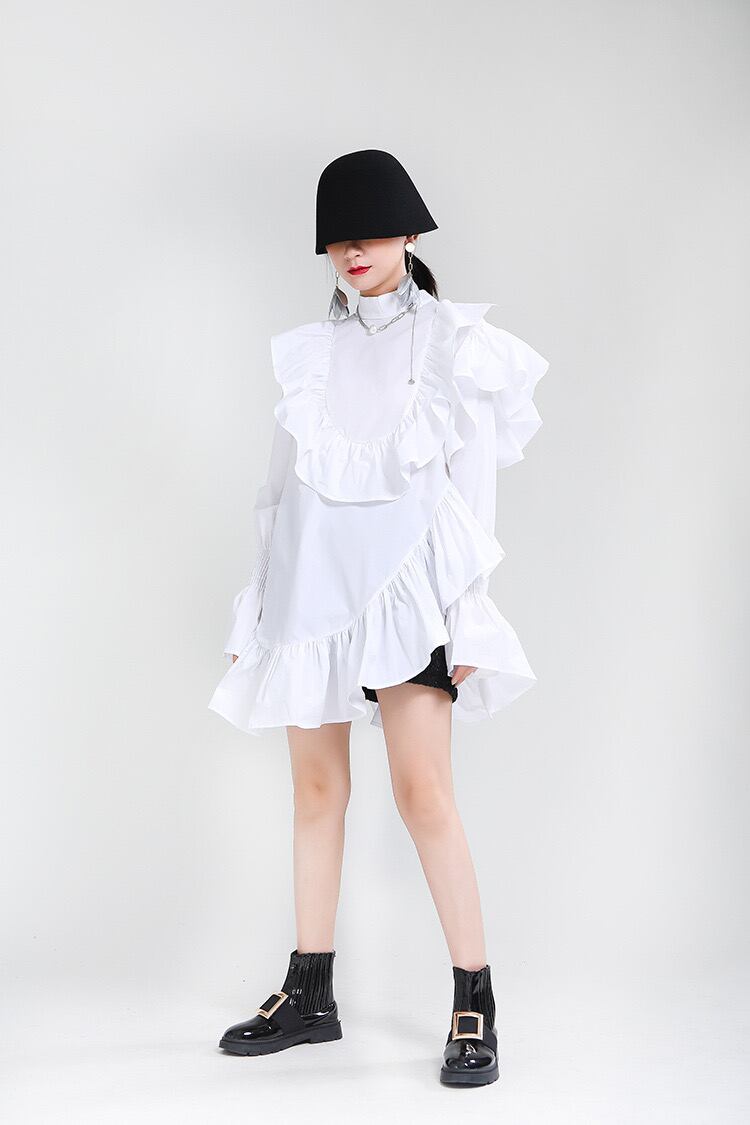 【送料無料】 ワンピース フリル アシンメトリー ハイネック ショート丈 長袖 ルーズ 韓国 レディース かわいい 可愛い キュート 大人可愛い 大人女子 個性的 きれいめ シンプル カジュアル 大人 上品 おしゃれ お洒落 こなれ感 きちんと 大人女子 エレガント フェミニン ワンサイズ ゆったり ゆる ホワイト ブラック 春 オルチャン 楽ちん 10代 20代 30代 女子会 デート 旅行 お泊まり 普段使い コーデ トレンド 美脚 脚長 スタイルアップ スタイル 安い