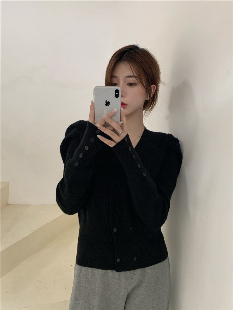 【送料無料】 ニット カーディガン ショート丈 黒 パフスリーブ 韓国 レディース 個性的パフショルダー ダブルボタン オールシーズン 秋冬 春夏 入学式 入園式 卒業式 卒園式 お宮参り 授乳服 オルチャン 前ボタン 授乳 楽ちん スタイルアップ 大人女子 きれいめ おしゃれ こなれ感 高級感 高見え 着痩せ 着やせ 謝恩会 結婚式 顔合わせ 保護者会 母 ママ 30代 40代 50代 長袖 体型カバー ブラック ブルー 上品 きちんと エレガント フェミニン 使いやすい お得 全2色