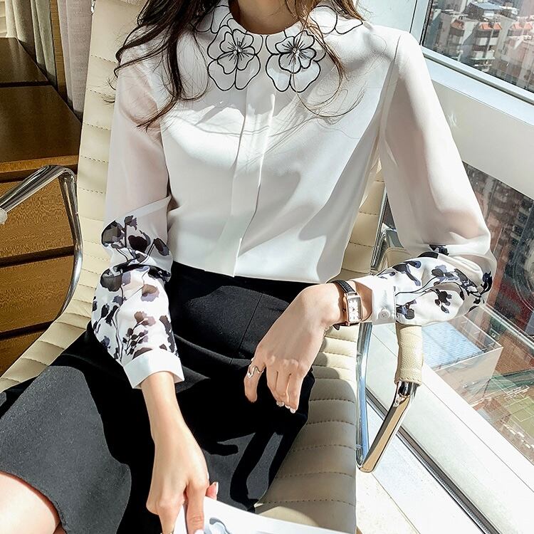 【送料無料】 ブラウス シャツ 花柄 花模様 襟 透け感 シアー 長袖 スリム 細身 韓国 レディース かわいい 可愛い キュート 大人可愛い 大人女子 個性的 きれいめ シンプル カジュアル 大人 気品 上品 おしゃれ お洒落 こなれ感 きちんと 大人女子 クール エレガント フェミニン S M L XL 2XL 白 ホワイト 秋 オルチャン 楽ちん 20代 30代 OL 通勤 オフィス 女子会 デート 旅行 お泊まり コーデ トレンド スタイルアップ スタイル 安い