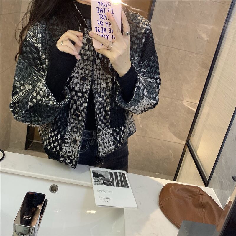【送料無料】 ツイード ジャケット 羽織 アウター ショート丈 チェック コントラストチェック柄 韓国 レディース 黒 ネイビー 個性的 カジュアル きれいめ きちんと 上品 おしゃれ お洒落 フェミニン 秋冬 春 オルチャン 高級感 高見え 大人女子 大人可愛い 大人 こなれ感 抜け感 長袖 着痩せ 着やせ 体型カバー スタイルアップ 普段使い デート 通勤 お呼ばれ 母 ママ 20代 30代 40代 50代 紺 ブラック 使いやすい 便利 楽ちん 安い 前ボタン チェック柄 クール