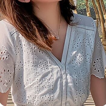 透け感と深Vネックが抜け感を演出し、体型カバーもばっちり。