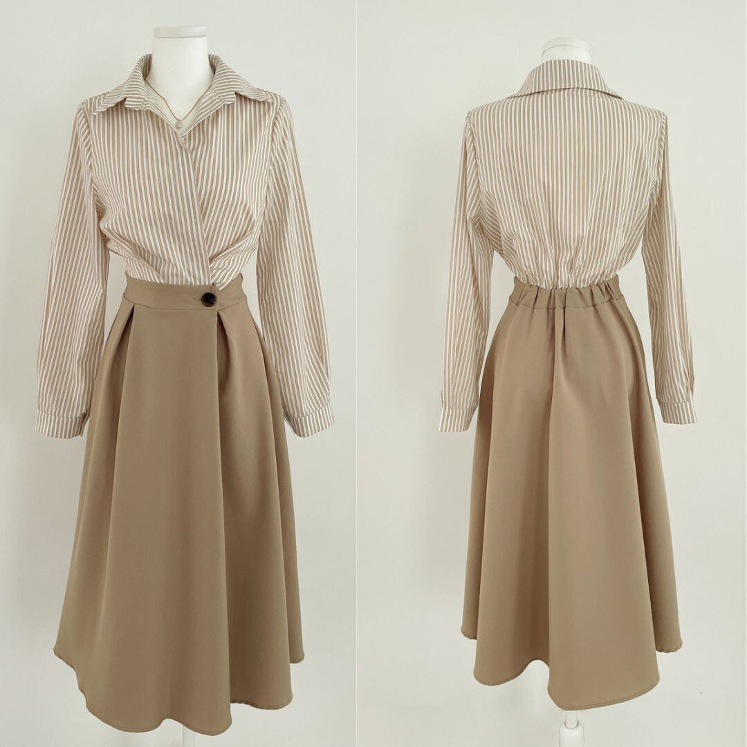 【送料無料】 ツーピース風ストライプシャツワンピース ストライプシャツワンピース シャツワンピース ストライプ ウエストマーク フェイクツーピース 韓国 レディース 大人 かっこいい きれいめ 高級感 高見え おしゃれ オルチャン 体型カバー お洒落 モテ 女っぽい 大人っぽい 上品 美人 エレガント オトナ女子 大人女子 主役級 存在感 スタイルアップ 入学式 入園式 卒業式 卒園式 大人可愛い こなれ感 ミモレ丈 通勤 オフィス オフィスカジュアル ビジネス OL ストライプ 美脚