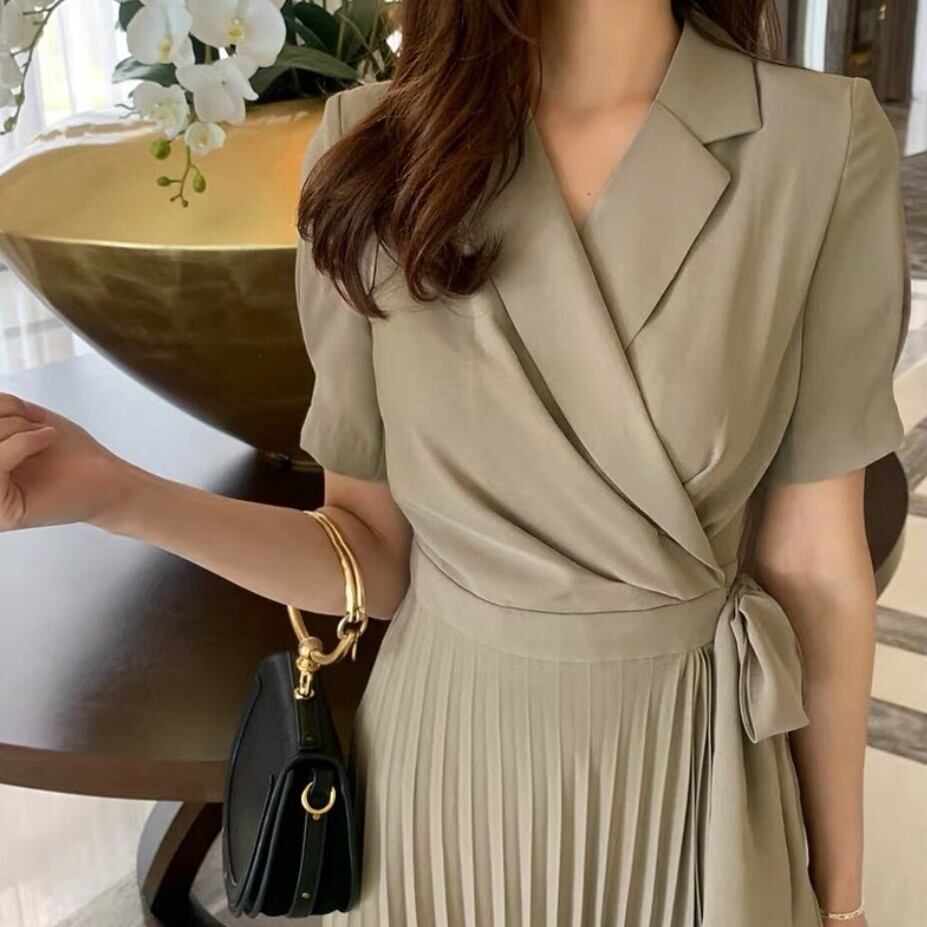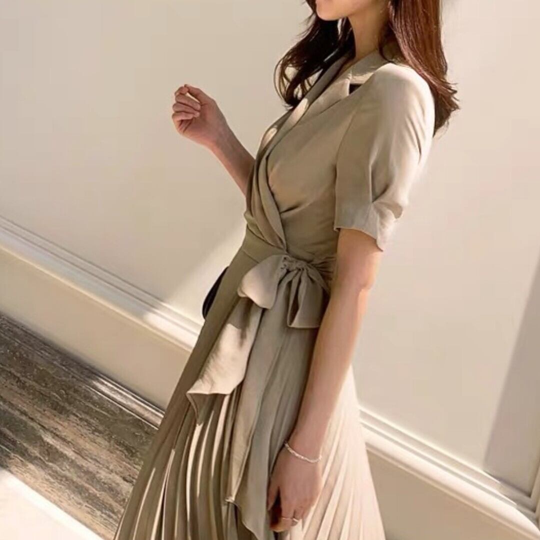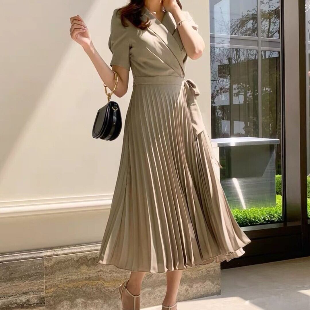 【送料無料】 ワンピース クロスボーダー ドレス 韓国 レディース 大人スタイル ハイウエスト プリーツスカート シフォン ミディ丈 ソリッドカラー 半袖 夏 春 秋 Vネック オフィス オルチャン 美ウエスト 美シルエット レースアップ OL セレモニースーツ フォーマルワンピース ママ 20代 30代 40代 結婚式ドレス 卒業式 入園式 通勤着 きれいめ 襟付き リボン 女子会 デート 参戦服 カシュクール 着痩せ 高級感 高見え スタイルアップ トレンド インスタ映え 大人可愛い