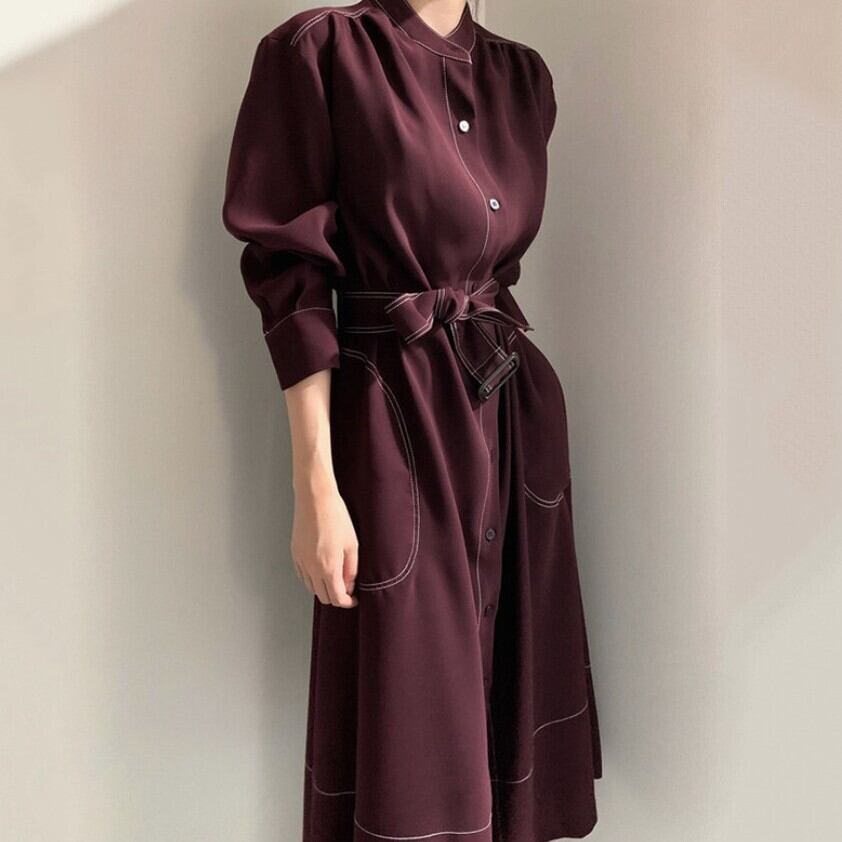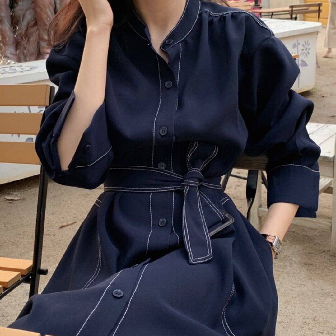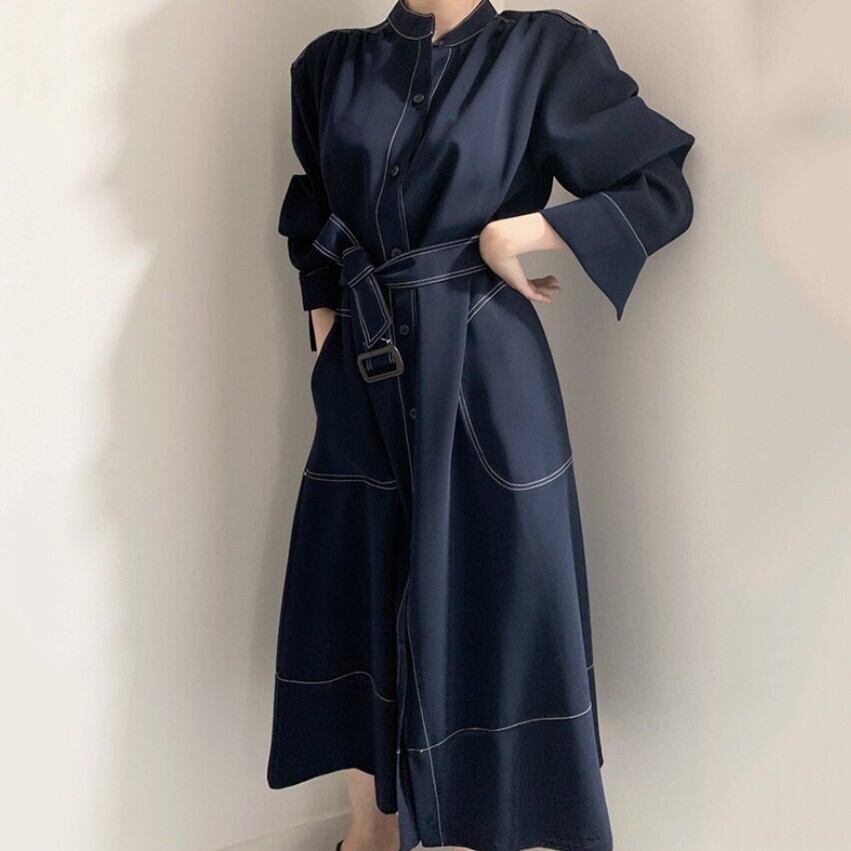 【送料無料】 ワンピース シック エレガント ドレス 韓国 レディース 大人スタイル ハイウエスト スタンドアップカラー ルーズ ロングスカート 長袖 春 秋 オフィス オルチャン スタンドカラー 美シルエット ソリッドカラー OL ママ 20代 30代 40代 カジュアル ゆったり 通勤着 きれいめ 羽織 リボン 女子会 デート 大人カジュアル 参戦服 デニム風 ストラップ 着痩せ 高級感 高見え スタイルアップ トレンド インスタ映え 大人可愛い Aライン シンプル ライン ベルト上品
