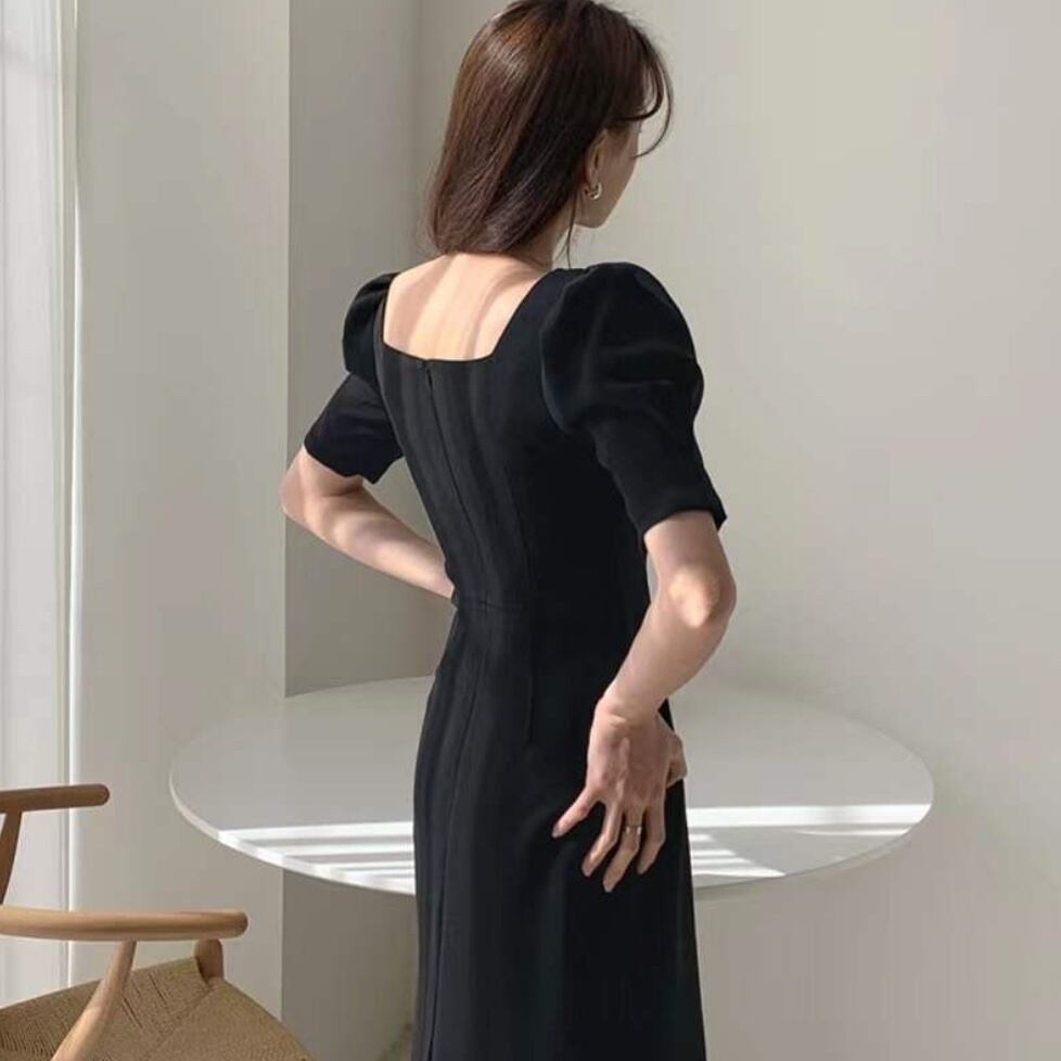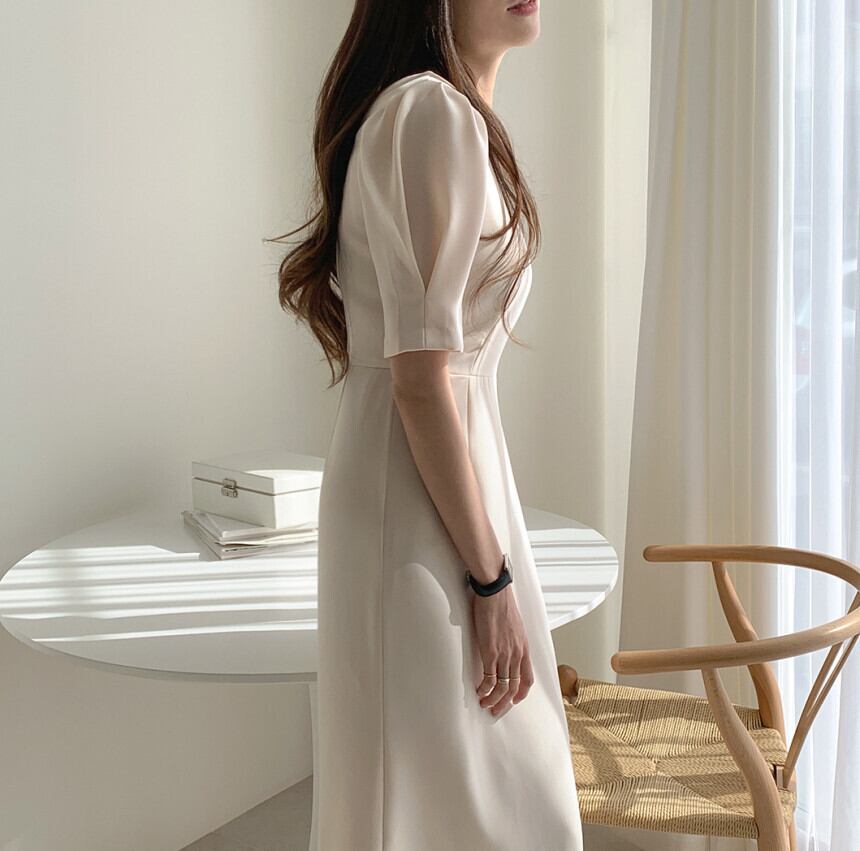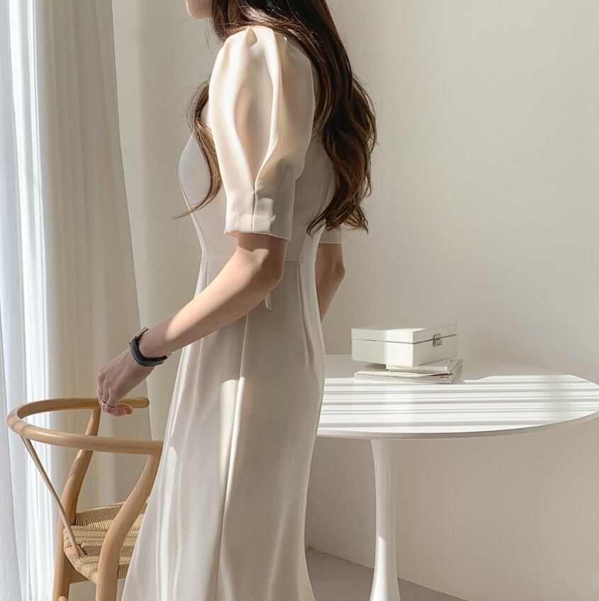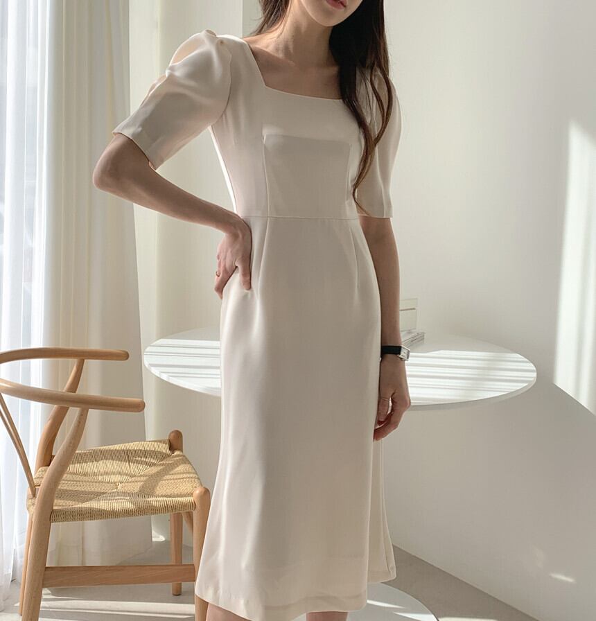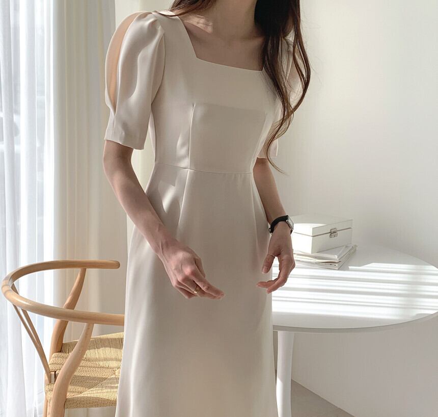 【送料無料】 ワンピース パフスリーブ シェイプライン 背中開き ミモレ丈 韓国 レディース オルチャン 5分袖 五分袖 ボリューム袖 ぽわん袖 スクエアネック タイト 細身 ウエストマーク バックシャン バックコンシャス ハイウエスト 薄手 かわいい 大人可愛い きれいめ シンプル 上品 おしゃれ ラブリー キュート フェミニン 無地 夏 休日 パーティー イベント デート 食事会 着回し 普段使い トレンド 流行 インスタ映え S M L 黒 ブラック アプリコット