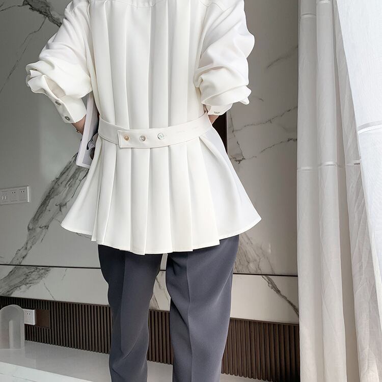 襟つきのシャツにバックプリーツのデザインがアクセントのブラウス。