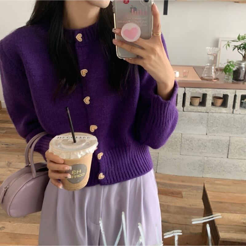 【送料無料】 カーディガン ニット ショート丈 カラフル ハートボタン パフスリーブ ビビットカラー 韓国 レディース オルチャン 長袖 Uネック ラウンドネック かわいい 大人可愛い きれいめ シンプル カジュアル おしゃれ かっこいい レトロ ラブリー キュート 抜け感 フェミニン ベーシック ナチュラル 無地 秋 冬 40代 50代 ママ 休日 着回し 普段使い 重ね着 楽ちん トレンド 流行 インスタ映え フリーサイズ ワンサイズ白 ホワイト緑 グリーン 紫 パープル