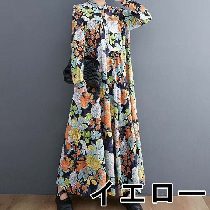 【送料無料】 ワンピース レトロ 花柄 ボタニカル マキシ丈 袖あり 長袖 ワイド 韓国 レディース ふんわり オルチャン 可愛い かわいい きちんと 大人可愛い きれいめ カジュアル 大人 おしゃれ お洒落 オトナ女子 大人女子 こなれ感 ラフ 個性的 主役級 存在感 フリーサイズ ゆったり ゆる 春 夏 秋 10代 20代 30代 女性用 母 通勤 オフィス OL 通学 デート 保護者会 女子会 お泊まり 休日 着回し 着痩せ 着やせ 体型カバー 普段使い 楽ちん 動きやすい 子連れ