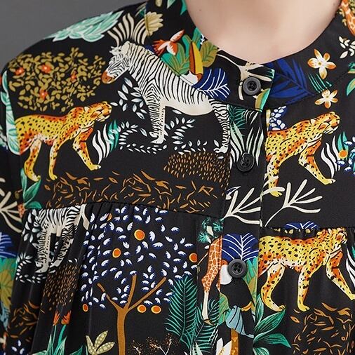 アニマル柄とボタニカル柄の組み合わせが個性的な印象を与え、マキシ丈でありながら袖もしっかりついているので、大人の女性にふさわしい上品な印象を演出します。