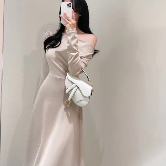 ミモレ丈とウエストマークが女性らしいシルエットを作り出し、袖ありで上品な印象を与えます。