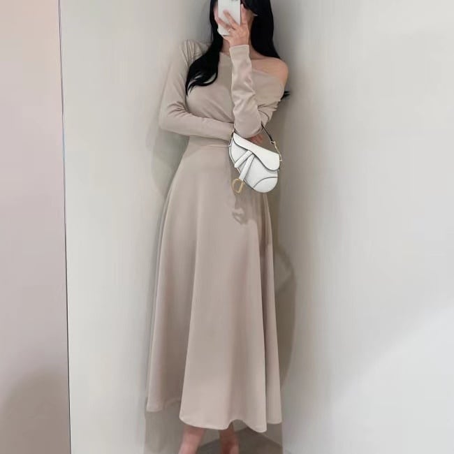 【送料無料】 ワンピース ドレス ワンショルダー ミモレ丈 ウエストマーク 袖あり 長袖 ワンショル セミフレア 韓国 レディース 肩出し オルチャン 可愛い かわいい きちんと 大人可愛い きれいめ シンプル カジュアル 大人 上品 おしゃれ お洒落 オトナ女子 大人女子 こなれ感 個性的 主役級 存在感 フリーサイズ ブラック 黒 無地 春 秋 同窓会 忘年会 10代 20代 30代 女性用 OL 通勤 通学 デート パーティー イベント 着回し 高級感 高見え 普段使い モテ