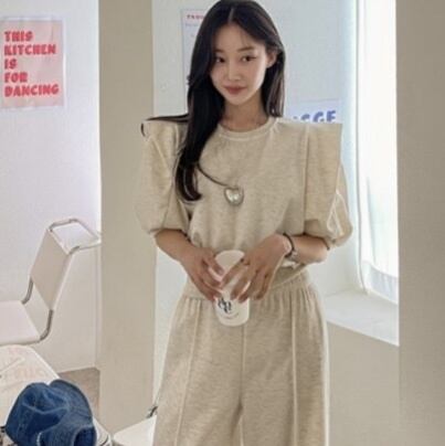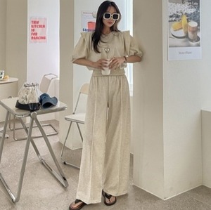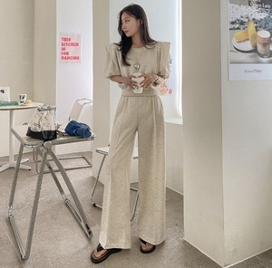【送料無料】 セットアップ カットソー パンツ パフT パフスリーブ Tシャツ ワイドパンツ センタープレス 韓国 レディース オルチャン 5分袖 五分袖 Uネック ラウンドネック ストレート ハイウエスト 大人可愛い シンプル カジュアル おしゃれ こなれ感 ラフ メンズライク 個性的 クール 抜け感 アクティブ 大人女子 無地 春 夏 女子会 休日 着回し 普段使い 重ね着 楽ちん 美脚 脚長 トレンド 流行 インスタ映え フリーサイズ ワンサイズ 白 ホワイト 黒 ブラック