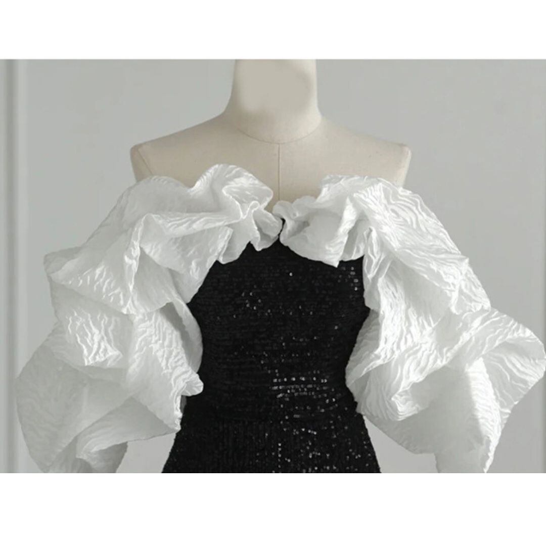 フリルやボリューム袖のディテールが個性的で、パーティーや結婚式などの特別なシーンで存在感を放つこと間違いなしです。