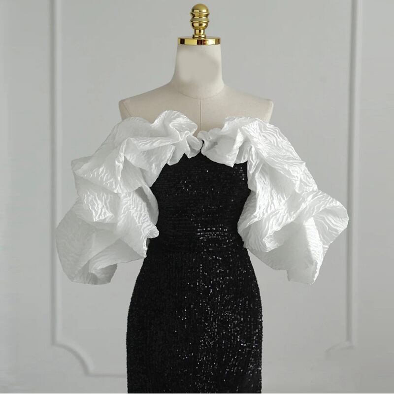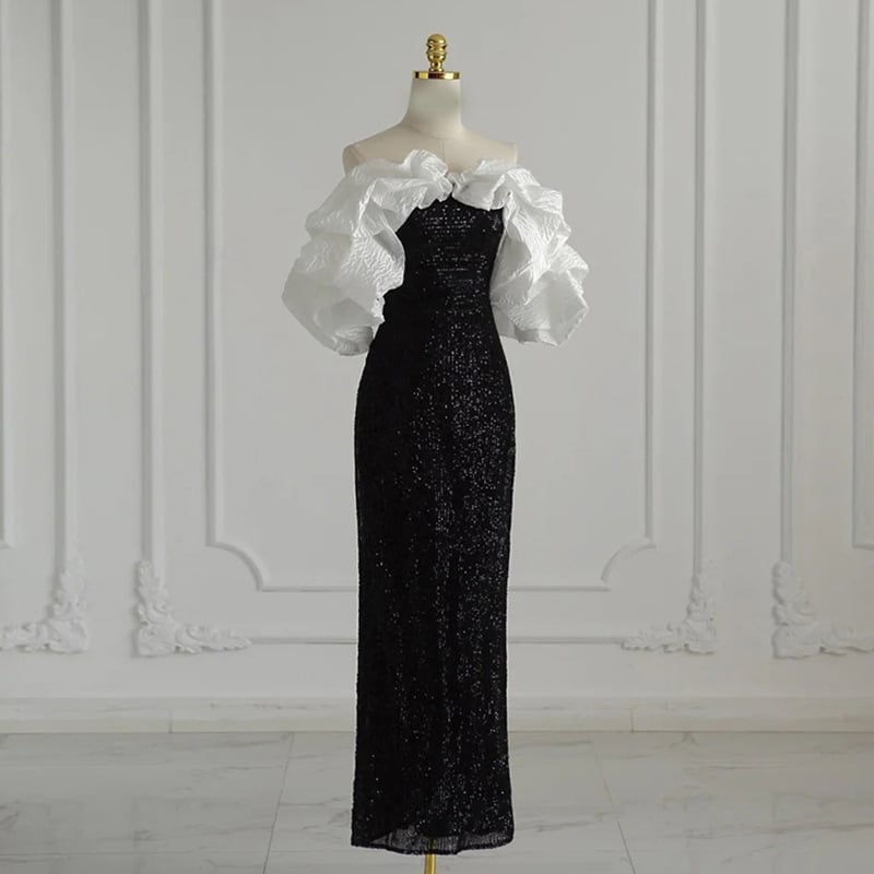 【送料無料】 ロングドレス パーティードレス マーメイド オフショルダー フリル 個性的 主役級 バックコンシャス きれいめ 韓国 レディース オルチャン 大人可愛い きちんと シンプル パフスリーブ フィッシュテール 上品 大人 お洒落 おしゃれ かっこいい セクシー フォーマル 存在感 エレガント クール こなれ感 大人女子 オトナ女子 胸開き 披露宴 二次会 結婚式 謝恩会 着痩せ 高級感 体型カバー 二の腕カバー スタイルアップ 体系カバー セレモニー イブニングドレス 白 黒 ボリューム袖