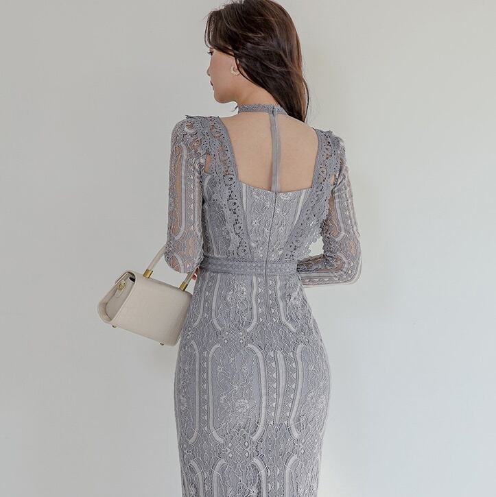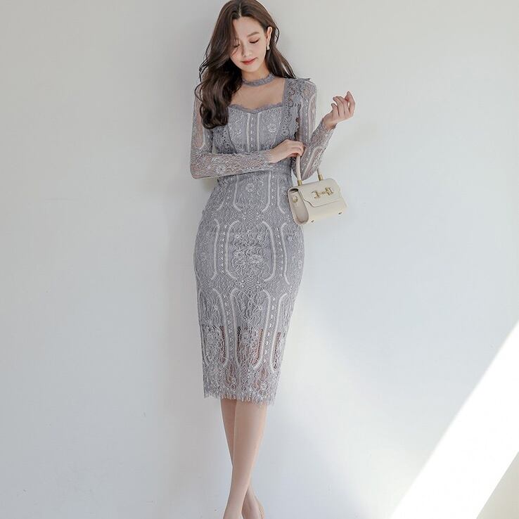 【送料無料】 レースワンピース タイトワンピース ドレス レース 総レース バックコンシャス チョーカーネック 韓国 レディース オルチャン グレー ミモレ丈 長袖 スリム 細身 ハイウエスト 大人可愛い きれいめ 上品 おしゃれ こなれ感 個性的 クール セクシー エレガント 存在感 フォーマル 抜け感 フェミニン オトナ女子 大人女子 高見え 春 秋 入学式 入園式 卒業式 卒園式 休日 パーティー イベント モテ 美脚 脚長 トレンド 流行 インスタ映え S M L XL