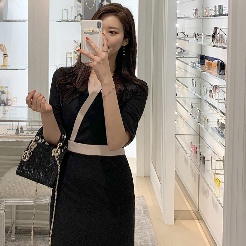【送料無料】 ワンピース ミモレ丈ワンピース ミモレ丈 五分袖 ウエストマーク ハイウエスト 黒 袖あり ストレート 5分袖 韓国 レディース オルチャン 大人 可愛い タイト スリム ドレス 細身 10代 20代 30代 上品 おしゃれ お洒落 オトナ女子 デート 女子会 S M L XL 結婚式 女子会 入学式 入園式 卒業式 卒園式 パーティー オフィスカジュアル プレゼント セレブ 着痩せ 二の腕カバー 通勤 モテ 美脚 同窓会 こなれ感 エレガント バイカラー 膝丈 ミディアム丈