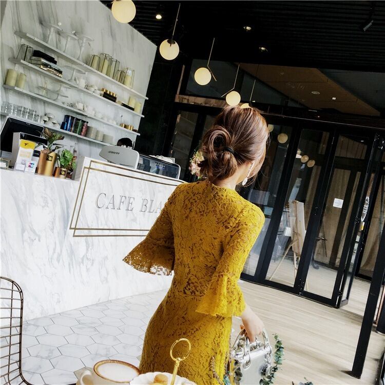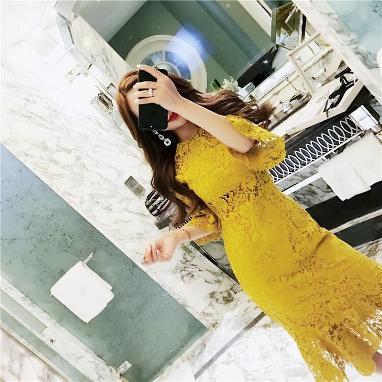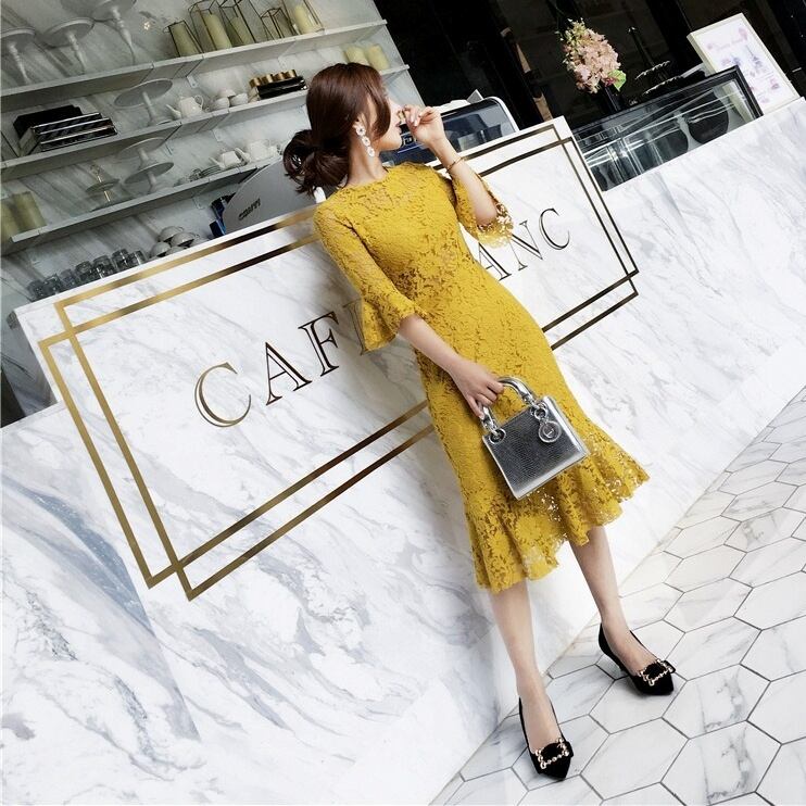 【送料無料】 総レース 花柄ワンピース マーメードレースワンピース 花柄 ベルスリーブ マーメイド マスタード 韓国 レディース オルチャン ミモレ丈 Iライン フリルスカート デート パーティー ミモレ丈ワンピース 膝丈 ミディアム丈 ハイウエストドレス 黄色 イエロー 袖あり ストレート 5分袖 大人 可愛い スリム レース 細身 入学式 入園式 結婚式 卒業式 卒園式 10代 20代 30代 上品 おしゃれ お洒落 オトナ女子 デート 女子会 M L XL 二の腕カバー ボリューム袖