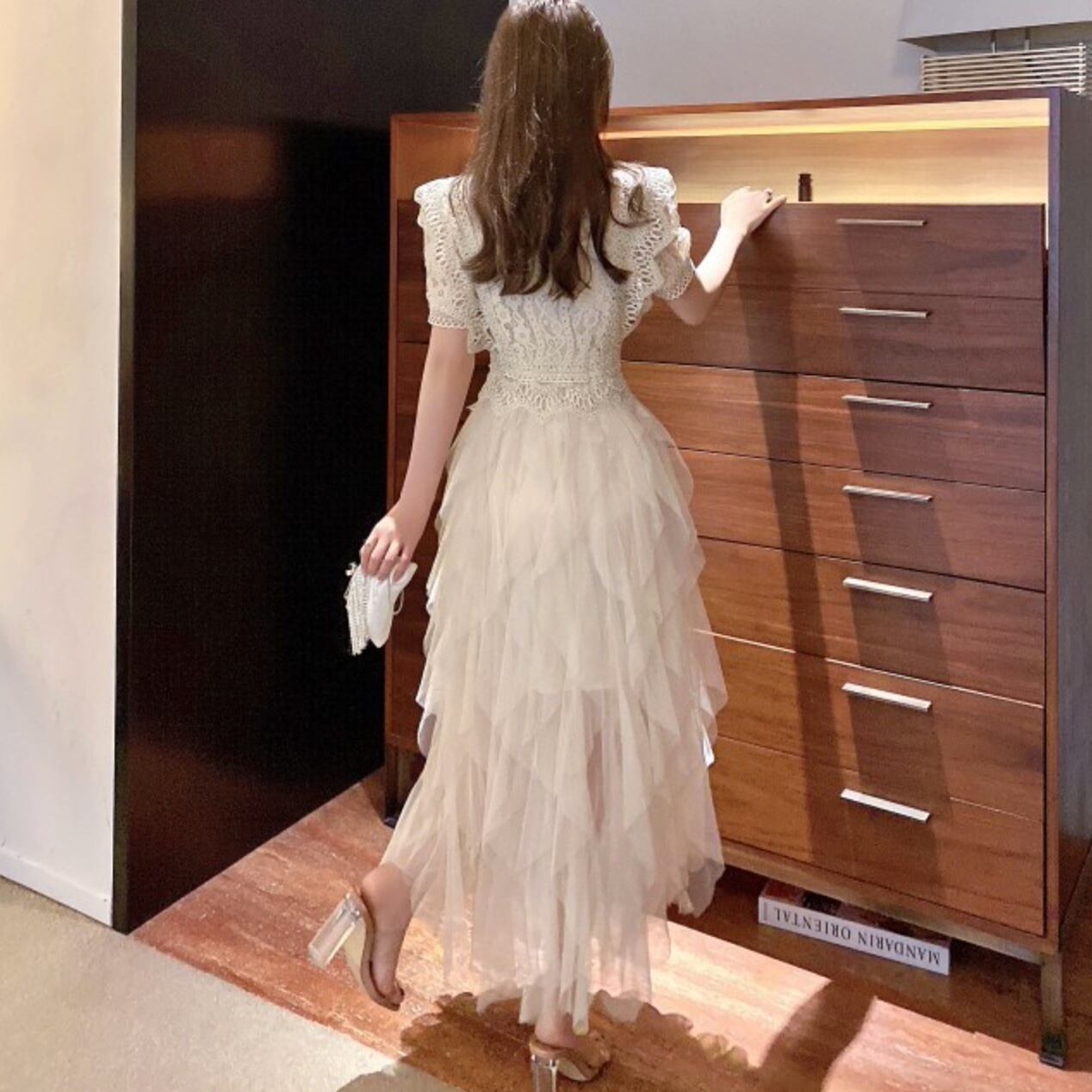 【送料無料】 チュールワンピース ドレス チュール ワンピース レース シースルー 韓国 レディース オルチャン アプリコット グレー ワンピドレス ロング丈 半袖 ラウンドネック Aライン フレア フリル ウエストマーク 切り替えデザイン ドッキング かわいい 大人可愛い きれいめ おしゃれ ラブリー キュート エレガント モダン 主役級 存在感 フォーマル 華やか お嬢様 スタイリッシュ 休日 イベント モテ インスタ映え 夏 ブライダル お呼ばれ ステージ 撮影 S M L