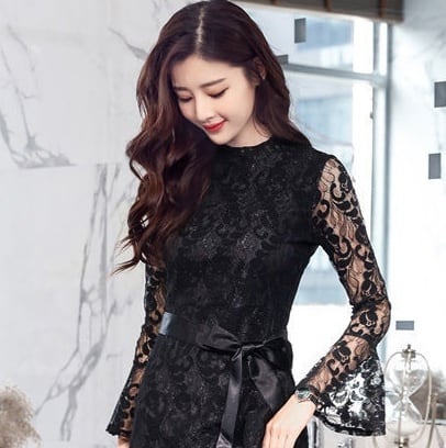 【送料無料】 総レース シアー ワンピース ベルスリーブ 韓国 レディース オルチャン 黒ブラック 膝丈 ひざ丈 長袖 ベルスリーブ Uネック ラウンドネック スリム タイト 細身 プリーツ 刺繍 フリル リボン ウエストリボン バックシャン 透け感 シースルー 薄手 かわいい 大人可愛い きれいめ 大人 上品 おしゃれ ラブリー キュート エレガント フォーマル 抜け感 フェミニン 高見え 休日 パーティー イベント デートトレンド 流行 インスタ映え 清楚 S M L XL 2XL 3XL