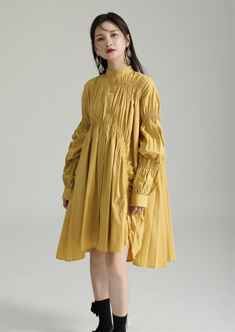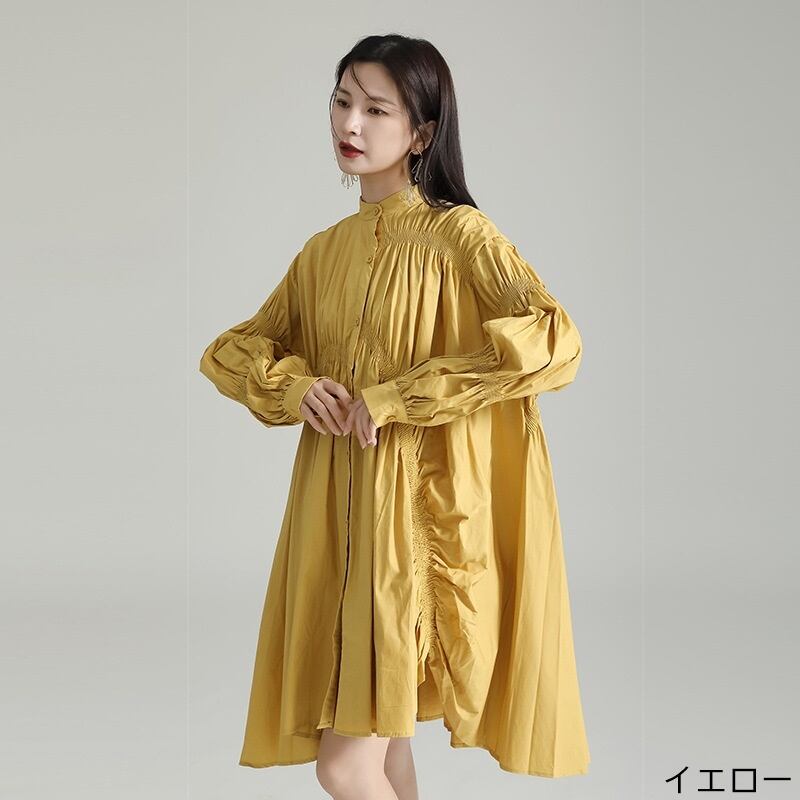 シャーリング入りのフロントボタンがアクセントになっている個性的なデザインのシャツワンピ。