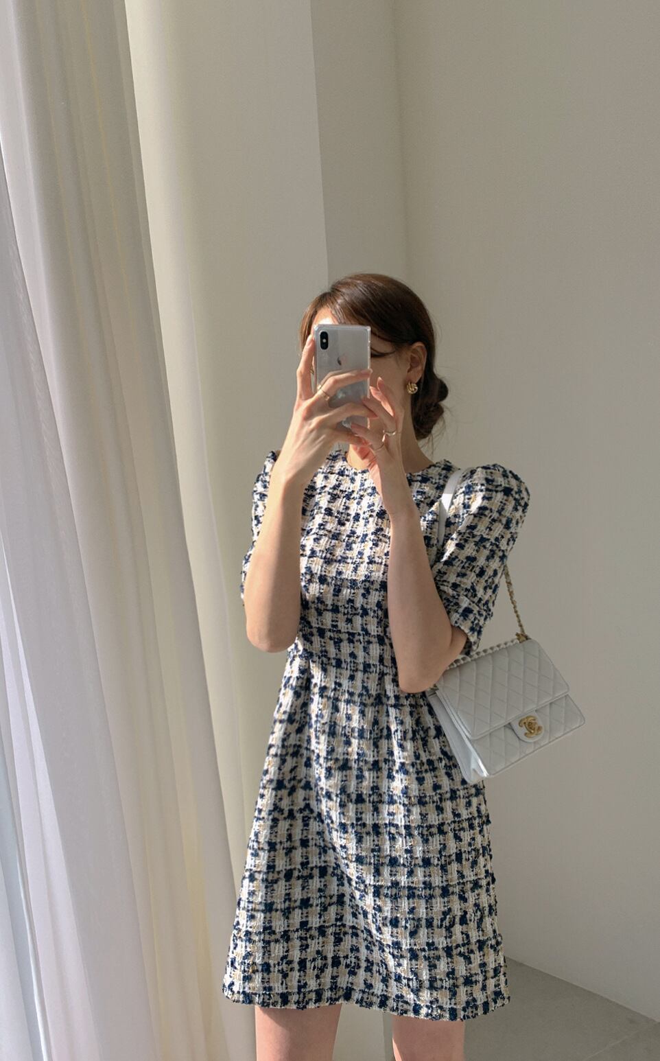 華やかな大人可愛いツイードチェックミニワンピース。
