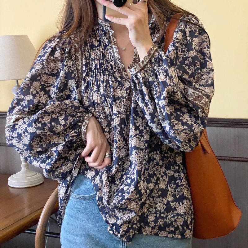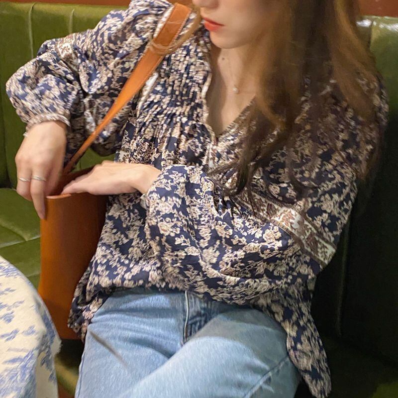 【送料無料】 シャツ シフォン パフスリーブ ボリューム レディース オルチャン 柄 韓国 ブルー ブラウス 長袖 襟なし 透け感 かわいい 大人可愛い きれいめ シンプル カジュアル 大人 おしゃれ かっこいい レトロ アジアン 大人女子 こなれ感 ラフ キュート ルーズ 個性的 クール エレガント モダン 抜け感 10代 20代 30代 40代 50代 60代 女性用 ママ デート 女子会 お泊まり 休日 ショッピング 着回し 普段使い コーデ スタイル モテ 体系カバー 定番