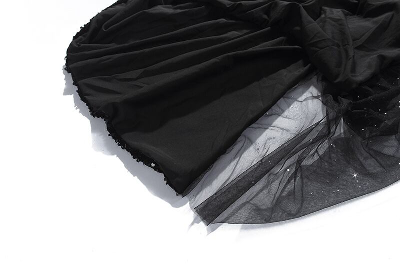 夜のパーティーシーンを彩る鮮やかな輝きを纏ったイブニングドレス。
