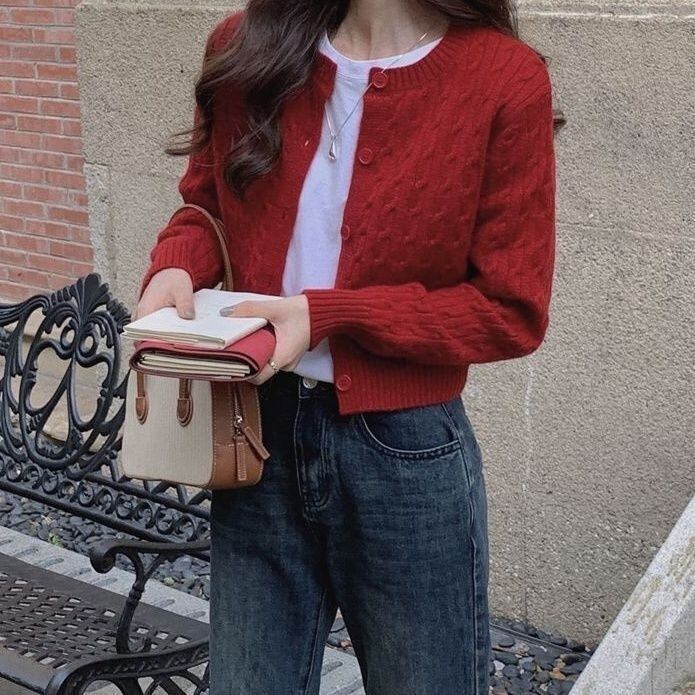 【送料無料】 ニットカーディガン カーディガン 長袖 Uネック 襟なし 楽ちん 白 グレー 韓国 レディース オルチャン フロントボタン 着回し ニット セーター 着やせ 二の腕カバー ツイストセーター 赤 20代 30代 40代 50代 普段使い オフィス ママ 重ね着 動きやすい 子連れ 休日 フリーサイズ かわいい カジュアル シンプル ケーブルニット こなれ感 前ボタン ユニセックス 女性用 レッド ホワイト 通勤 ラウンドネック 伸縮性 秋冬 秋 冬 上着 ママ クリスマス