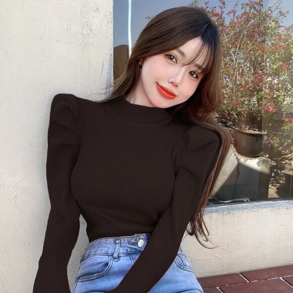 【送料無料】 ニット 長袖 リブニット ハーフネック パフスリーブ 韓国 レディース オルチャン 襟なし スリム タイト 細身 セクシー 無地 女子会 可愛い 大人可愛い きれいめ 大人 上品 オトナ女子 白 黒 ピンク オレンジ ブラック ホワイト 秋冬 秋 冬 フリーサイズ 二次会 大人カラー 同窓会 食事会 10代 20代 30代 デート 伸縮性 タートルネック セーター 旅行 着回し 着痩せ 二の腕カバー スタイルアップ あったか モテ プレゼント トレンド