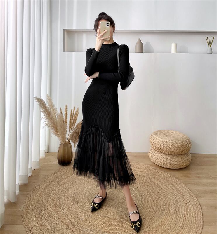 【送料無料】 ニットワンピース チュールワンピース 異素材ミックス ドッキング 韓国 レディース オルチャン 黒 ブラック ロング丈 マキシ丈 長袖 ハイネック タートルネック スリム タイト 細身 マーメイド アシンメトリー 切り替えデザイン スマート レース チュール 透け感 シースルー かわいい 大人可愛い おしゃれ こなれ感 ラブリー キュート モード系 セクシー エレガント モダン 抜け感 無地 秋 冬 休日 イベント モテ トレンド 流行 インスタ映え フリーサイズ