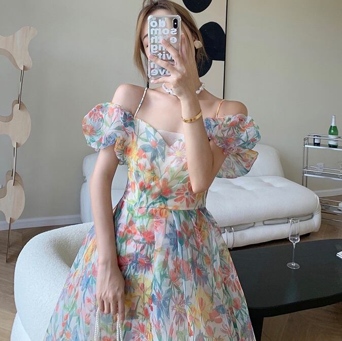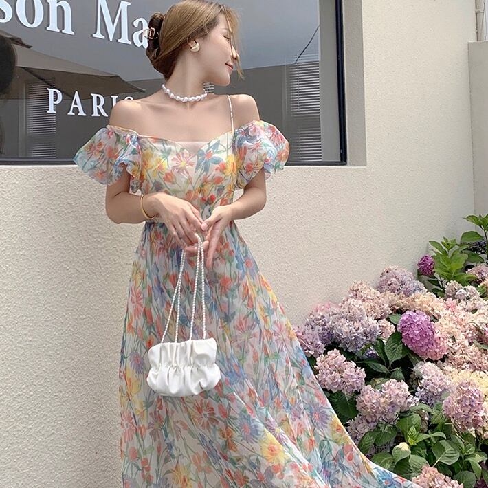 【送料無料】 シフォンロングドレス パフスリーブ パーティードレス韓国 レディース オルチャン 背中開き バックコンシャス リゾートワンピ 花柄 フラワー パステル マキシ丈 パフスリーブ オフショルダー フレア Aライン 胸元 ウエストマーク ハイウエスト 透け感 かわいい 大人可愛い おしゃれ かっこいい こなれ感 ラブリー キュート セクシー 抜け感 フェミニン 夏 休日 パーティー イベント 旅行 海 デート ビーチ 着回し 普段使い トレンド 流行 インスタ映え S M L