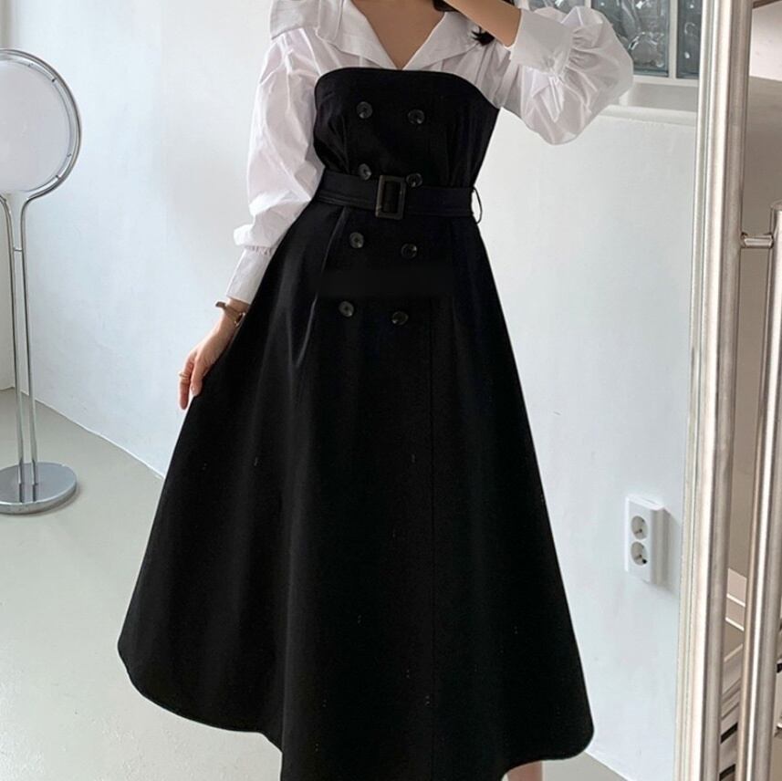 【送料無料】 ダブルブレストコンビシャツワンピース ドッキングワンピース ハイウエスト 韓国 レディース オルチャン 黒 ブラック ベージュ ミモレ丈 長袖 Vネック 襟付き フレア Aライン ウエストマーク ベルト きれいめ シンプル カジュアル おしゃれ かっこいい こなれ感 ラブリー キュート 抜け感 フェミニン アクティブ ベーシック ナチュラル 無地 春 秋 休日 カフェ ライブ デート 食事会 着回し 普段使い モテ トレンド 流行 インスタ映え 清楚 フリーサイズ