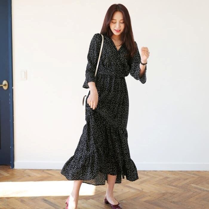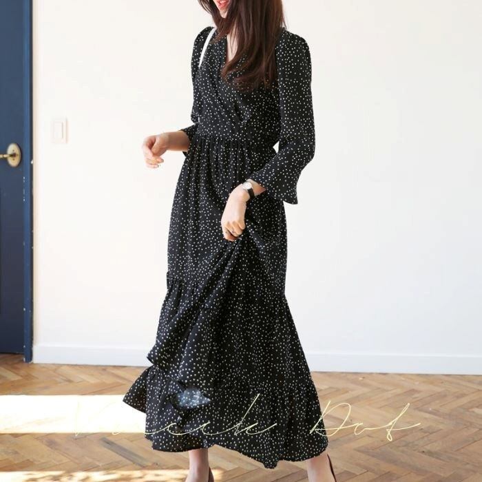 【送料無料】 ワンピース マキシ ロングワンピース ドット Vネック 7分袖 韓国 レディース オルチャン 水玉 フレア Aライン ロング丈 マキシ丈 白 黒 ハイウエスト スリム 細身 かわいい 可愛い 七分袖 キュート 大人可愛い 大人女子 シンプル きれいめ 大人 気品 上品 おしゃれ お洒落 こなれ感 きちんと 大人女子 クール エレガント フェミニン フリーサイズ ホワイト ブラック 夏 10代 20代 30代 デート 休日 普段使い コーデ トレンド 美脚 脚長 インスタ映え