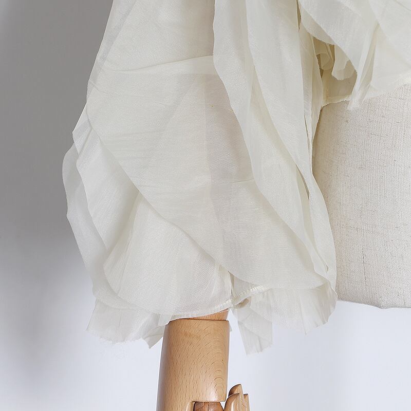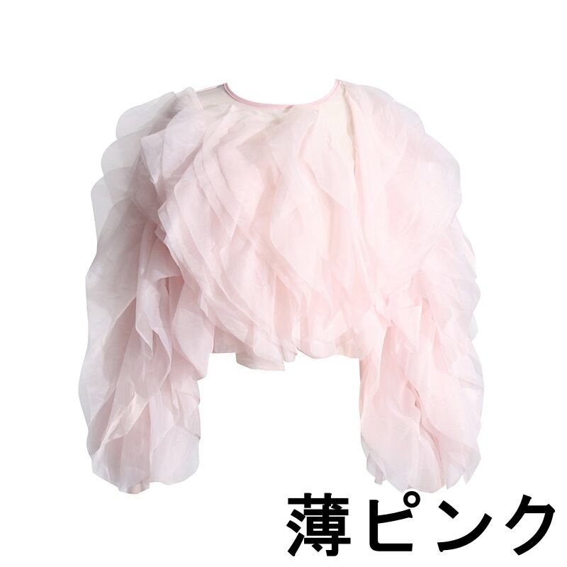 袖ありで、ボリューム袖が特徴的なデザインで、さらりとした透け感がシースルーの素材感を引き立てます。