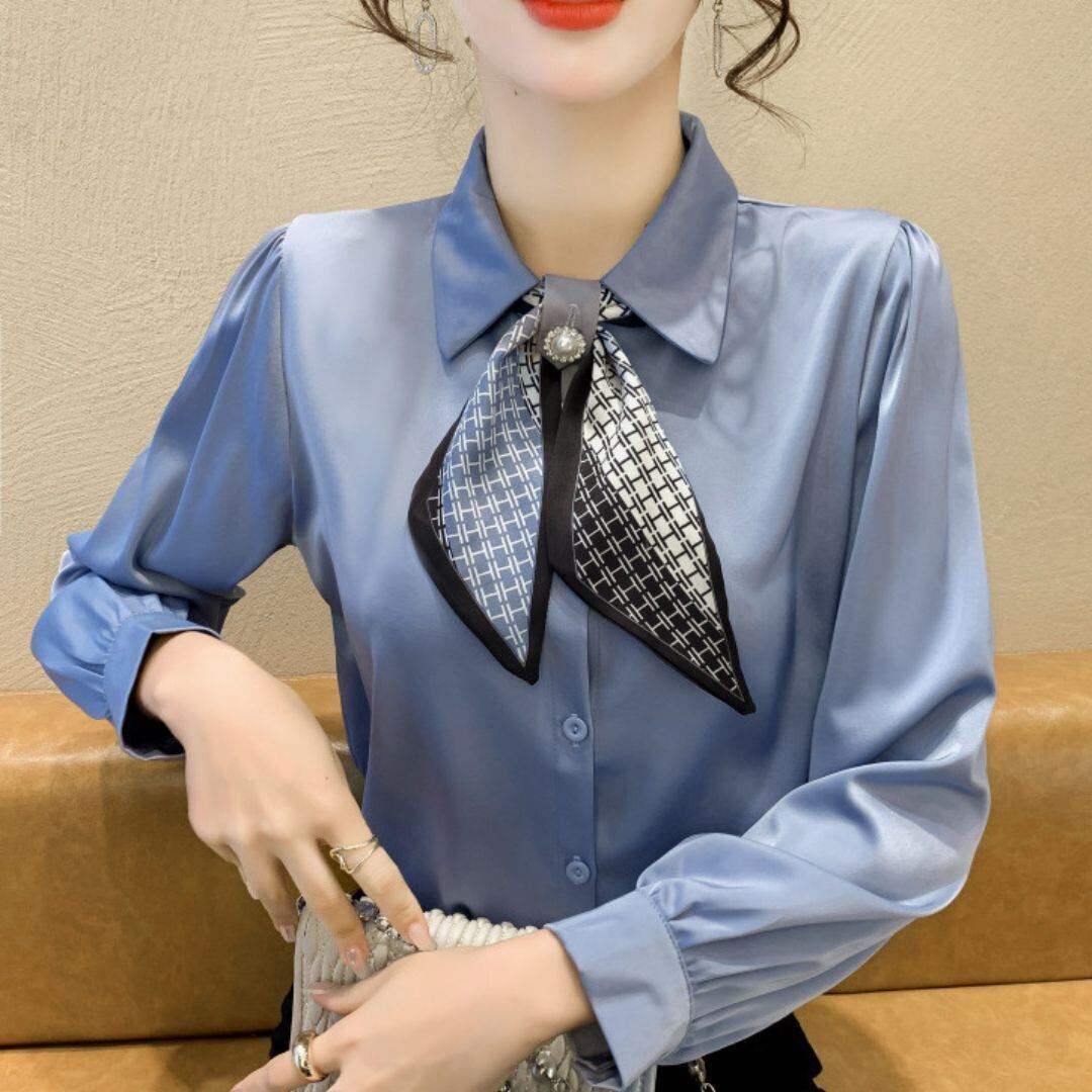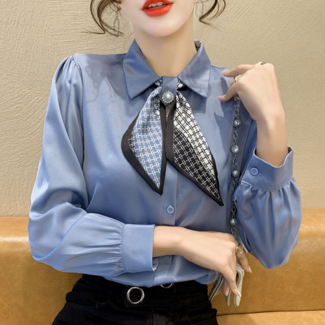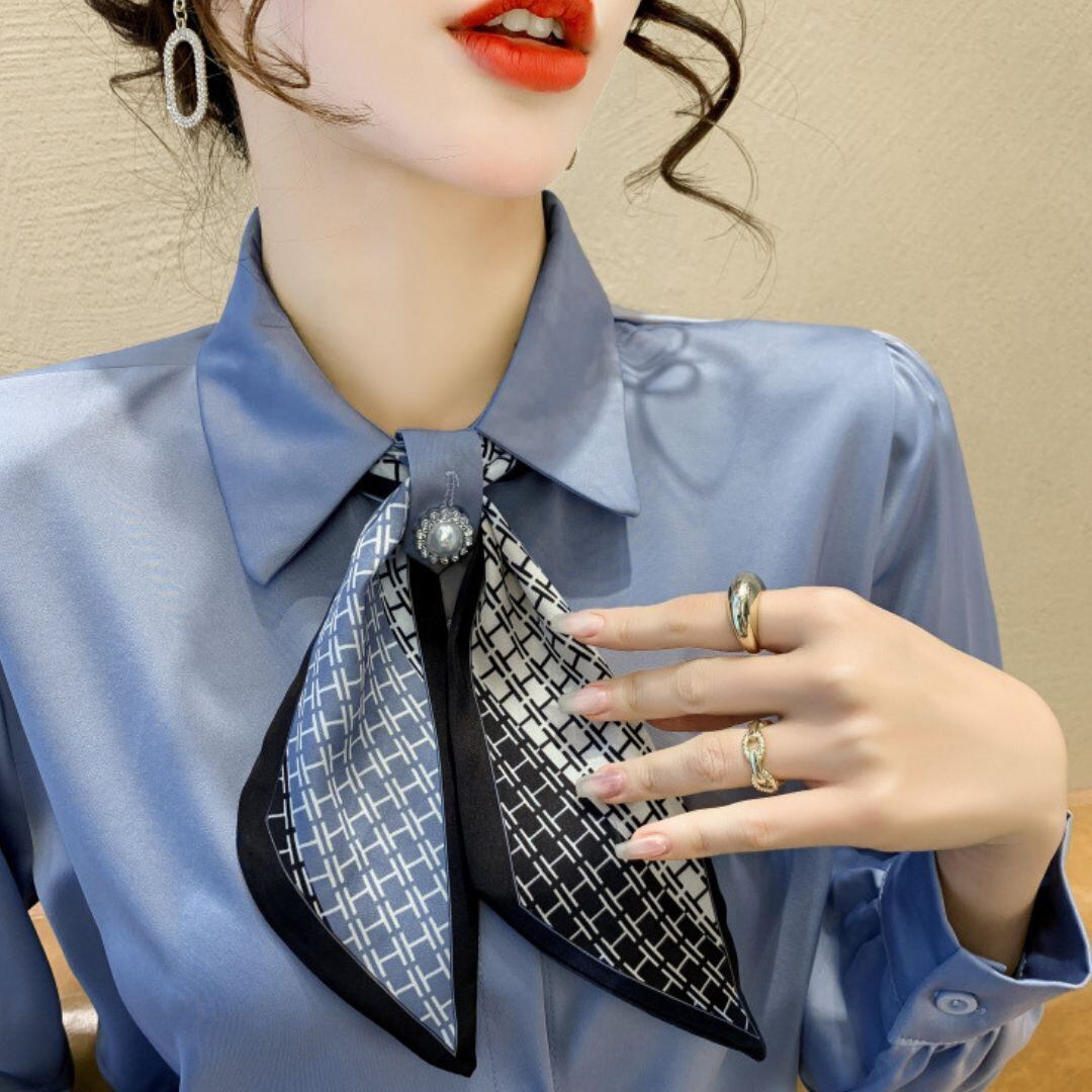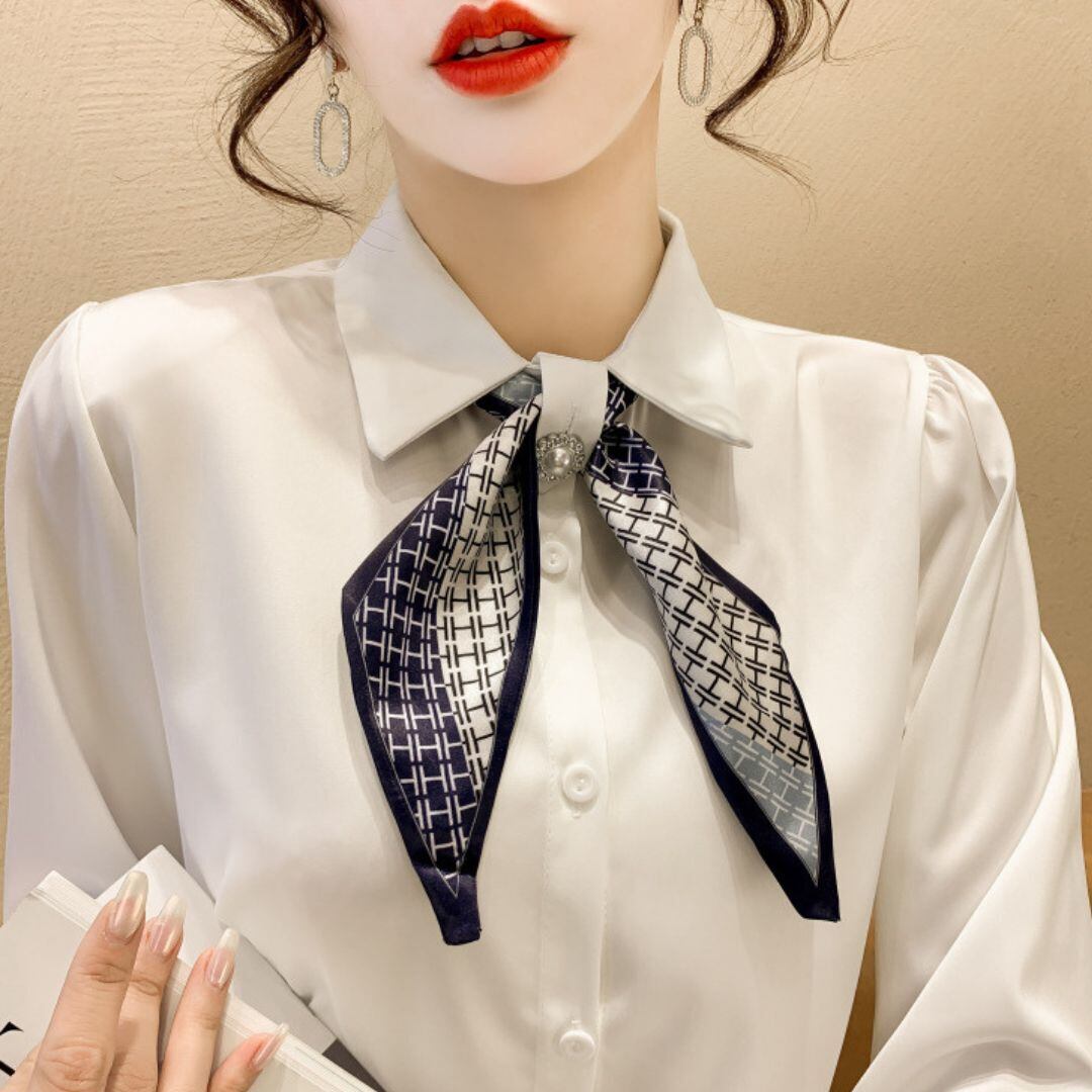 エレガントさを演出するサテンブラウスにパールボタンとスカーフが付いたシャツ。