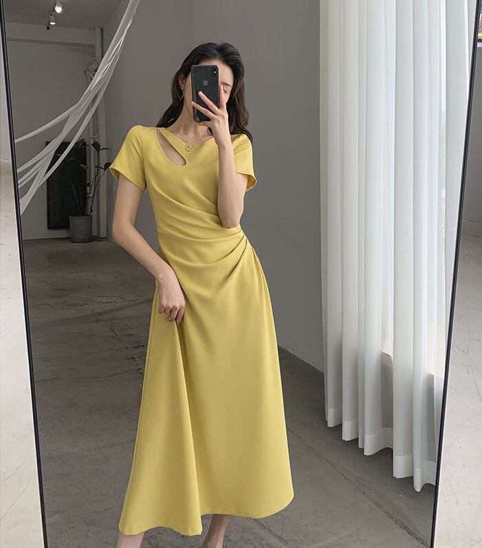 【送料無料】 ワンピース アシンメトリーロングドレス ロング丈 半袖 シャーリング アシンメトリー ハイウエスト スリム 細身 韓国 レディース かわいい 可愛い キュート 大人可愛い 大人女子 シンプル きれいめ 大人 気品 上品 おしゃれ お洒落 こなれ感 きちんと 大人女子 セクシー クール エレガント フェミニン M L XL イエロー グリーン ブルー ブラック 夏 オルチャン 10代 20代 30代 お呼ばれ デート コーデ トレンド 美脚 脚長 インスタ映え