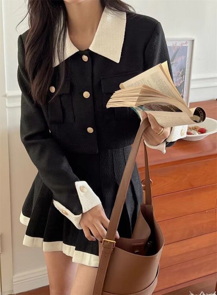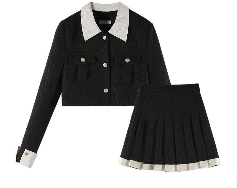 【送料無料】 セットアップ スカート プリーツ 2点セット オルチャン ジャケット ミニ レディース 韓国 ブラック ブラウン 黒 茶色 上着 ミニスカート 膝上 長袖 襟付き スリム 細身 ポケット ハイウエスト クロップド かわいい おしゃれ ラブリー キュート ルーズ 個性的 誕生日 10代 20代 女性用 女の子 デート 女子会 お泊まり 休日 パーティー イベント 旅行 ショッピング 着回し 普段使い コーデ スタイル 楽ちん モテ 美脚 脚長 定番