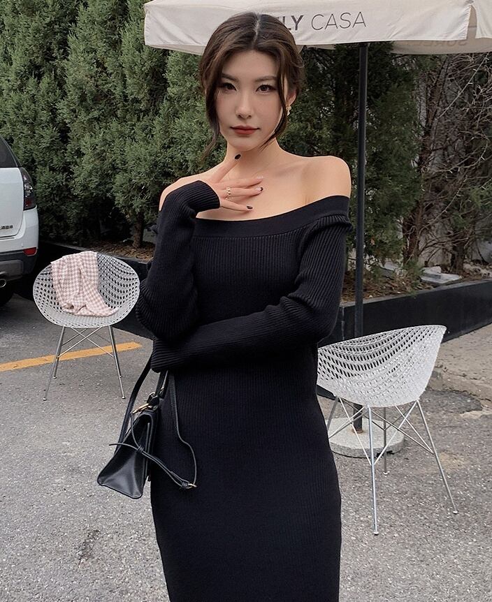 ボートネック、オフショルの2WAYで着用できるニットワンピース。