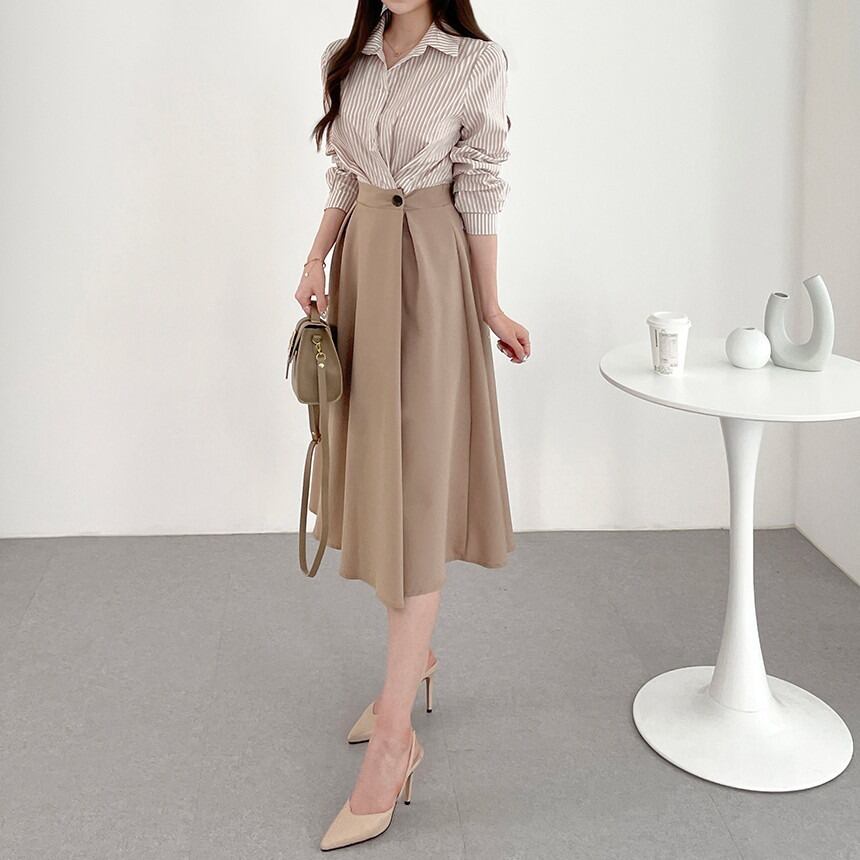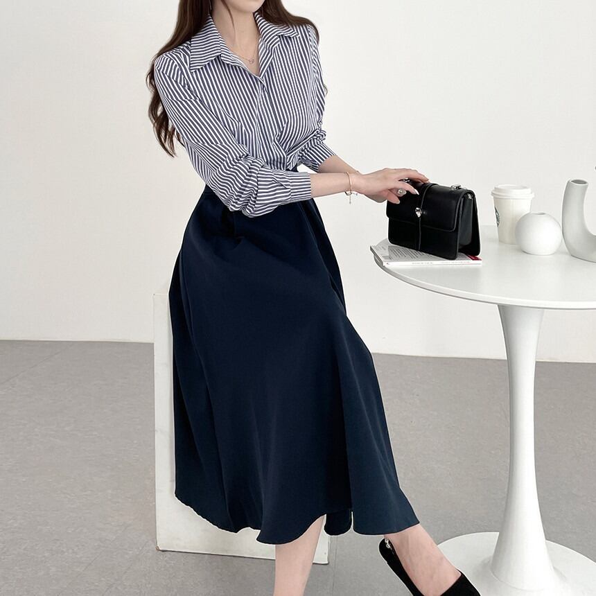 【送料無料】 シャツワンピース ワンピース ストライプ ミモレ丈 長袖 韓国 レディース オルチャン ツーピース風 膝下 ミモレ 袖あり 襟付き ロングワンピース ロング丈 かわいい Vネック Aライン ボタン 大人可愛い きれいめ シンプル シャツ 大人 春夏 上品 おしゃれ お洒落 大人可愛い 大人女子 こなれ感 ラブリー キュート 主役級 存在感 抜け感 春 夏 秋 10代 20代 30代 オフィス ビジネス OL 通勤 通学 デート 女子会 休日 イベント 普段使い 重ね着