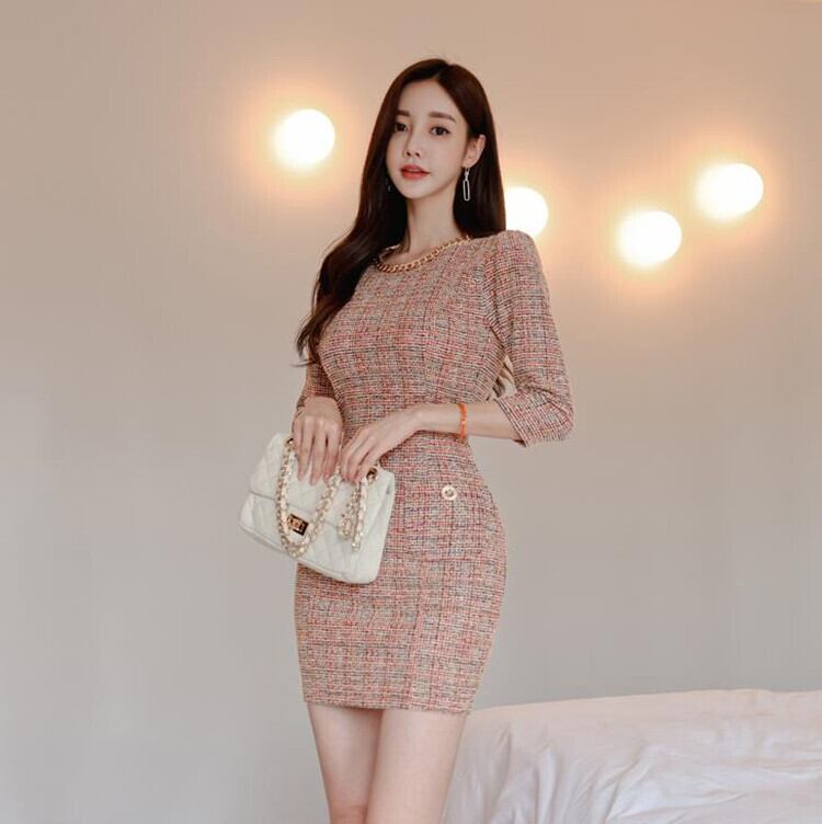 【送料無料】 ツイードミニワンピース ツイードワンピース ツイード ワンピース ミニワンピース ピンク ミニワンピ タイトワンピース きれいめ 上品 ツイード調 七分袖 ミニ ハイウエスト タイト スリム 韓国 レディース かわいい 可愛い キュート 大人可愛い 大人女子 きれいめ 大人 おしゃれ お洒落 大人女子 エレガント フェミニン S M L XL 秋冬 オルチャン 20代 30代 お呼ばれ 女子会 デート ショッピング コーデ トレンド インスタ映え スタイルアップ