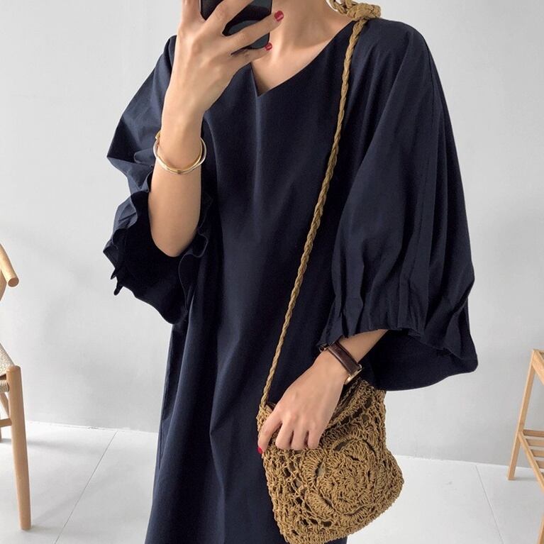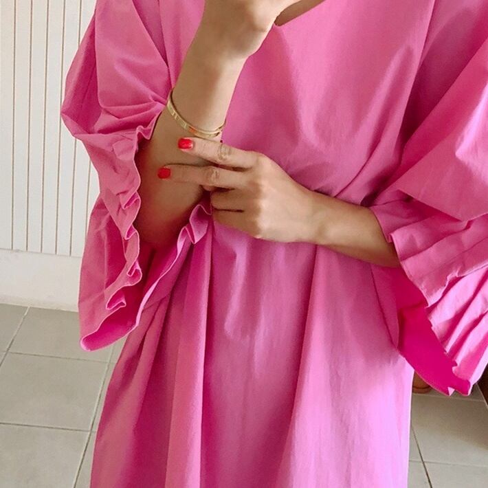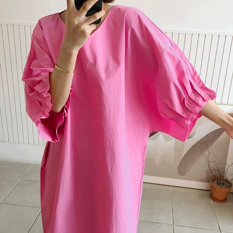 【送料無料】 ワンピース マキシ ロング丈 カジュアル フリル 黒 ピンク 韓国 レディース オルチャン 袖あり 個性的 かわいい 大人可愛い ロングスカート シンプル 大人 Aライン リゾート 南の島 海 お洒落 大人可愛い ぽっちゃり こなれ感 ラフ キュート ルーズ XL L M 存在感 5分袖 ぽわん袖 抜け感 夏 春 春夏 ブラック 10代 20代 30代 デート 公園 女子会 お泊まり ゆったり 休日 イベント 旅行 着回し 普段使い 重ね着 チュニック