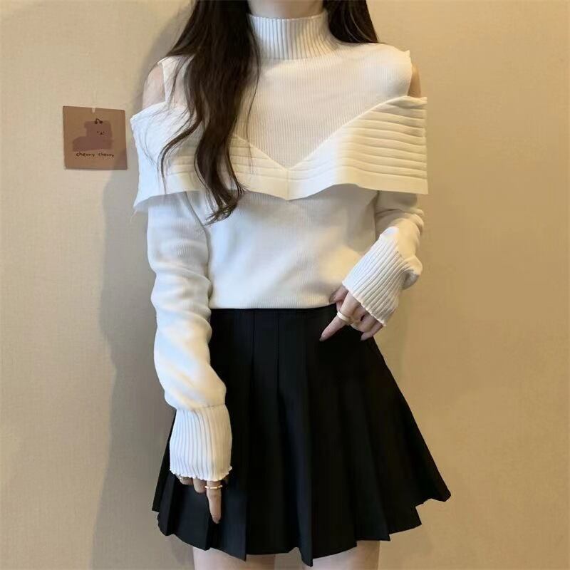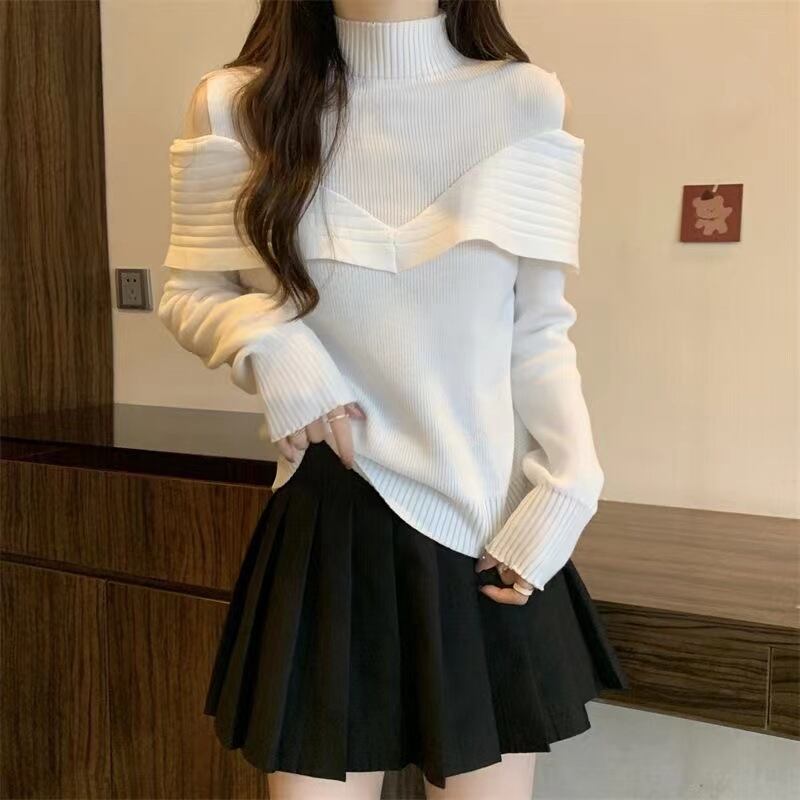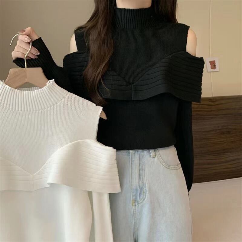 【送料無料】 オープンショルダートップス ハーフネック ニット オルチャン 韓国 レディース ブラック ホワイト 黒 白 デザイン ニットソー 長袖 スリム 細身 かわいい 大人可愛い きれいめ シンプル 大人 上品 おしゃれ 大人女子 こなれ感 キュート ルーズ 個性的 クール 抜け感 無地 女性用 ママ 通勤 通学 デート 女子会 休日 旅行 レストラン ショッピング 着回し 普段使い コーデ スタイル 楽ちん モテ 体系カバー ギフト 定番 トレンド 流行