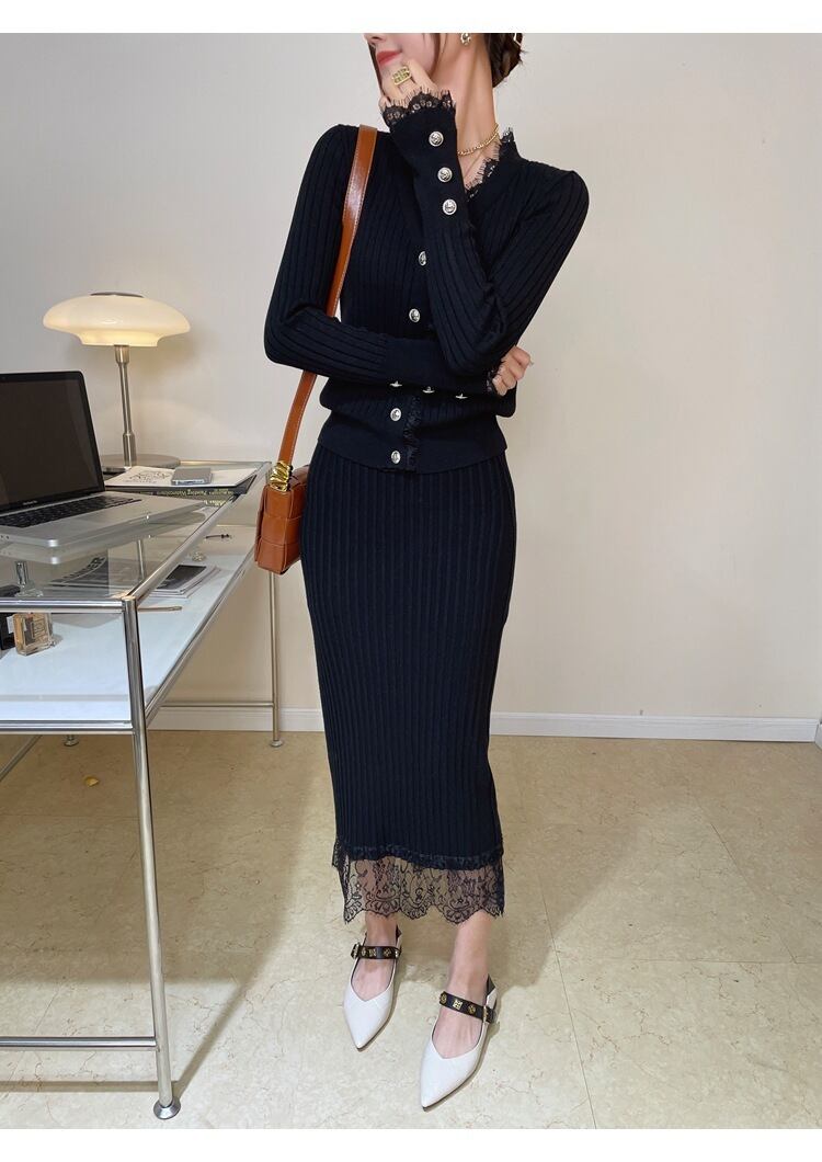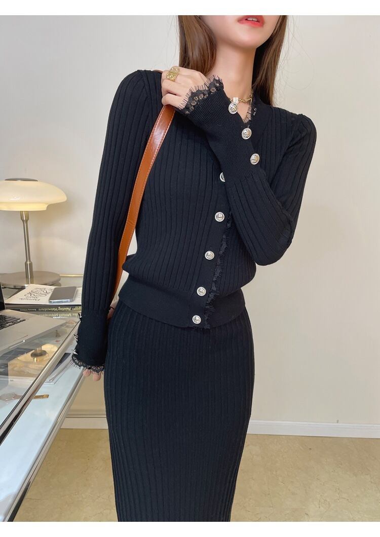【送料無料】 ニットスカートセットアップ リブニット ロングスカート オルチャン レディース ツーピース 韓国 ブラック パープル ホワイト レース Vネック ニットソー カーディガン 膝下 9分丈 長袖 スリム タイト 細身 ストレート Iライン スマート リブ ボタン かわいい 大人可愛い きれいめ 大人 上品 おしゃれ 大人女子 こなれ感 キュート 個性的 クール セクシー エレガント モダン 主役級 存在感 女性用 ママ デート 女子会 お泊まり 休日 ガーデン レストラン