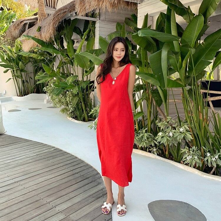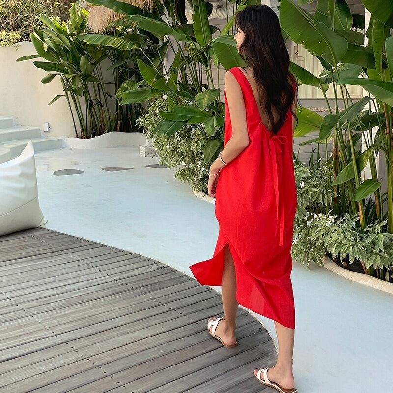 【送料無料】 ワンピース マキシワンピース ミモレ丈 キャミソール Aライン ノースリーブ 韓国 レディース オルチャン かわいい 可愛い 谷間が見える ロング キュート 赤 レッド 背中開き 大人可愛い 大人女子 透け感 ルーズ スリット シンプル きれいめ カジュアル 大人 おしゃれ お洒落 こなれ感 大人女子 フェミニン フリーサイズ 無地 夏 オルチャン 10代 20代 30代 リゾート 海 女子会 デート お泊まり 旅行 コーデ トレンド 美脚 脚長 スタイル
