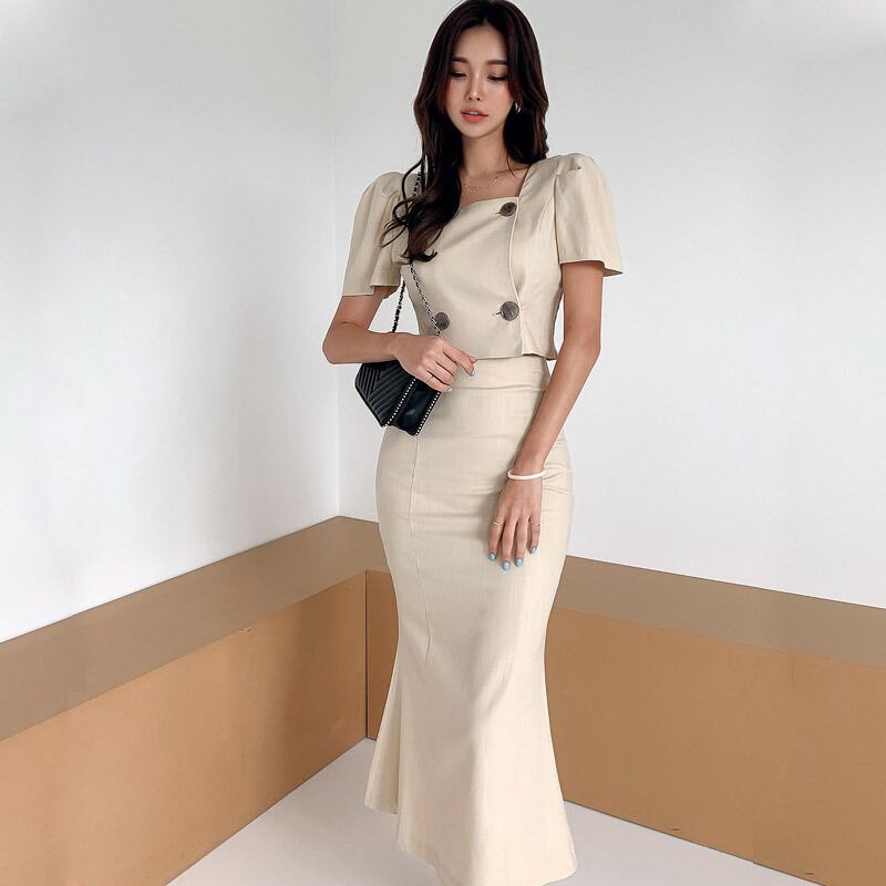 【送料無料】 ショートトップス マーメイドスカート セットアップ オルチャン 脚長 ツーピース レディース フィッシュテール 韓国 ベージュ 2点セット ロングスカート 半袖 スクエアネック スリム タイト 細身 ボタン ハイウエスト かわいい 大人可愛い きれいめ シンプル 大人 上品 おしゃれ かっこいい 大人女子 こなれ感 個性的 クール モード セクシー エレガント モダン デート 女子会 お泊まり パーティー イベント リゾート 旅行 レストラン ショッピング モテ 美脚 脚長