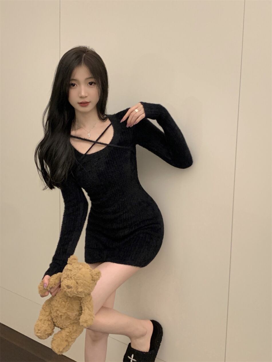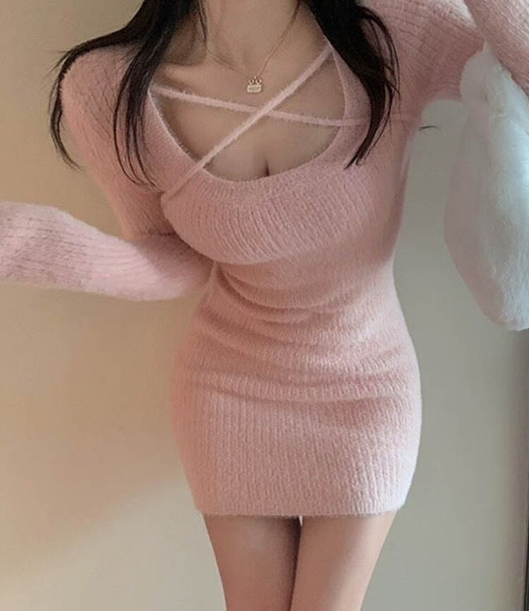 【送料無料】 クロスデザイン ミニ丈ワンピース タイトミニワンピース タイトワンピース ニットワンピース 韓国 レディース ショート丈 長袖ワンピース ニット セクシー 色っぽい 女っぽい オルチャン Uネック 襟なし スリム タイト 細身 かわいい 大人可愛い おしゃれ お洒落 大人女子 ラブリー キュート セクシー 無地 秋 冬 20代 30代 女性用 デート 女子会 パーティー イベント 着回し 普段使い 韓国系 インスタ映え フリーサイズ ホワイト ブラック ブルー ピンク
