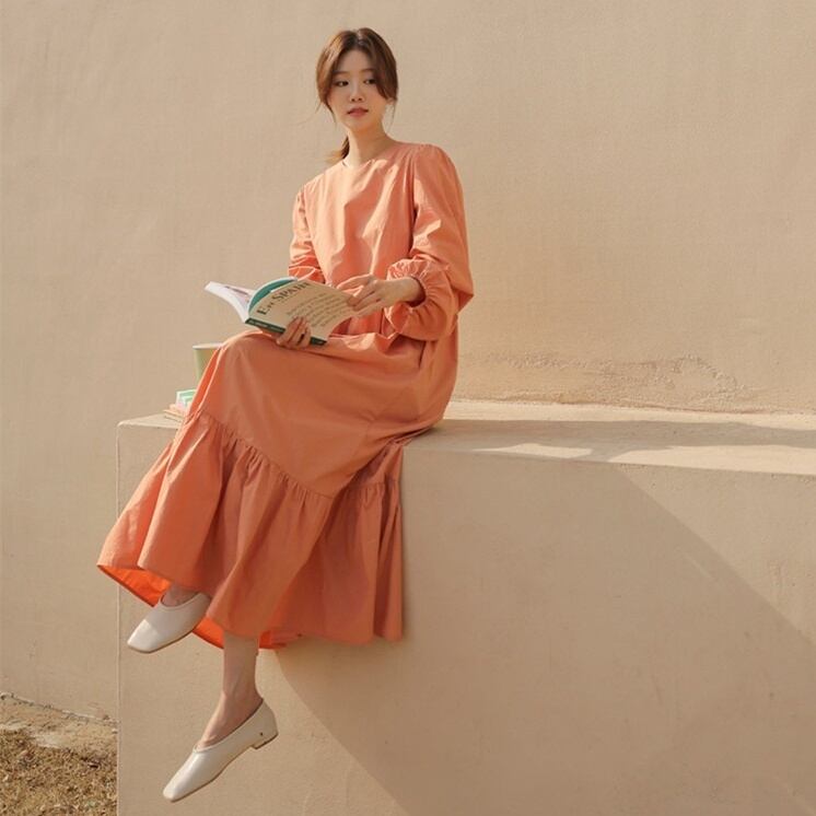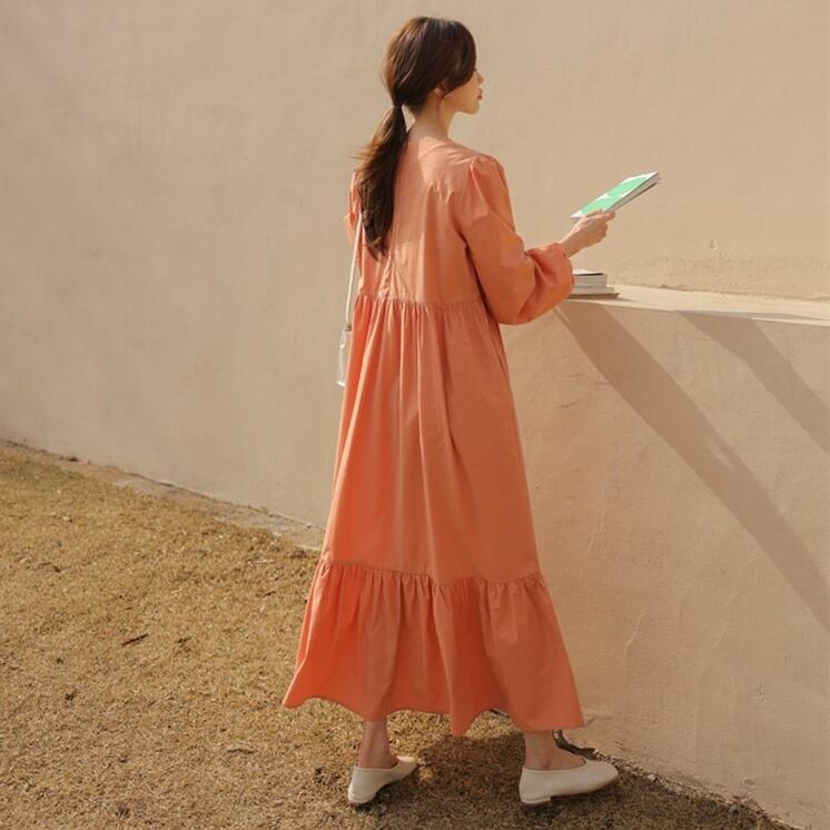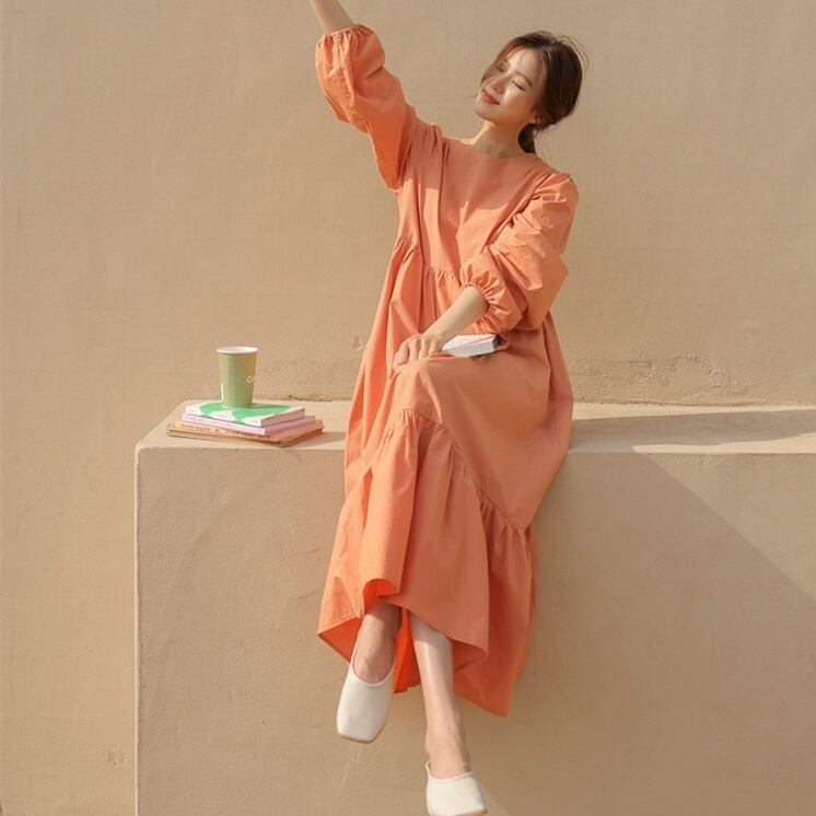 【送料無料】 マキシワンピース マキシ ロング丈 白 バルーン 韓国 レディース オルチャン ホワイト オレンジ リネンシャツ 7分袖 七分袖 Uネック 襟なし フレア Aライン かわいい 大人可愛い きれいめ おしゃれ こなれ感 ラフ ラブリー キュート エレガント S M L XL モダン ゆったり リゾート ぽわん袖 抜け感 フェミニン アクティブ ベーシック ナチュラル オトナ女子 大人女子 無地 夏 休日 カフェ デート トレンド 流行 インスタ映え 楽ちん 旅行
