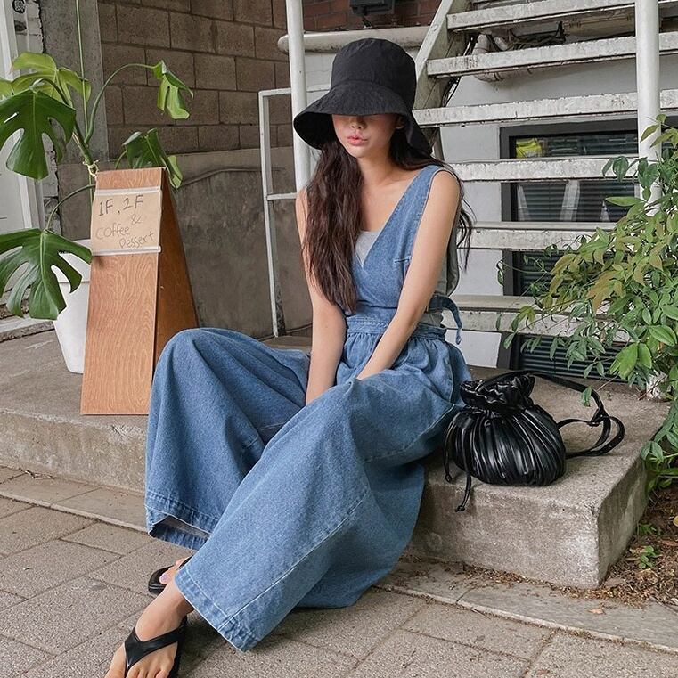 【送料無料】 オーバーオール デニム ワイドパンツ ロング丈 春 カジュアル 韓国 レディース オルチャン オールインワン 青 ブルー かわいい ジーンズ 袖なし Vネック ロング ストレート ウエストゴム シンプル 大人 ハイウエスト お洒落 大人可愛い 大人女子 こなれ感 ラフ キュート ルーズ XL L 存在感 抜け感 青 ブルー 夏 秋 10代 20代 30代 40代 通学 デート 公園 女子会 お泊まり 休日 イベント 旅行 着回し 普段使い 重ね着 コーデ