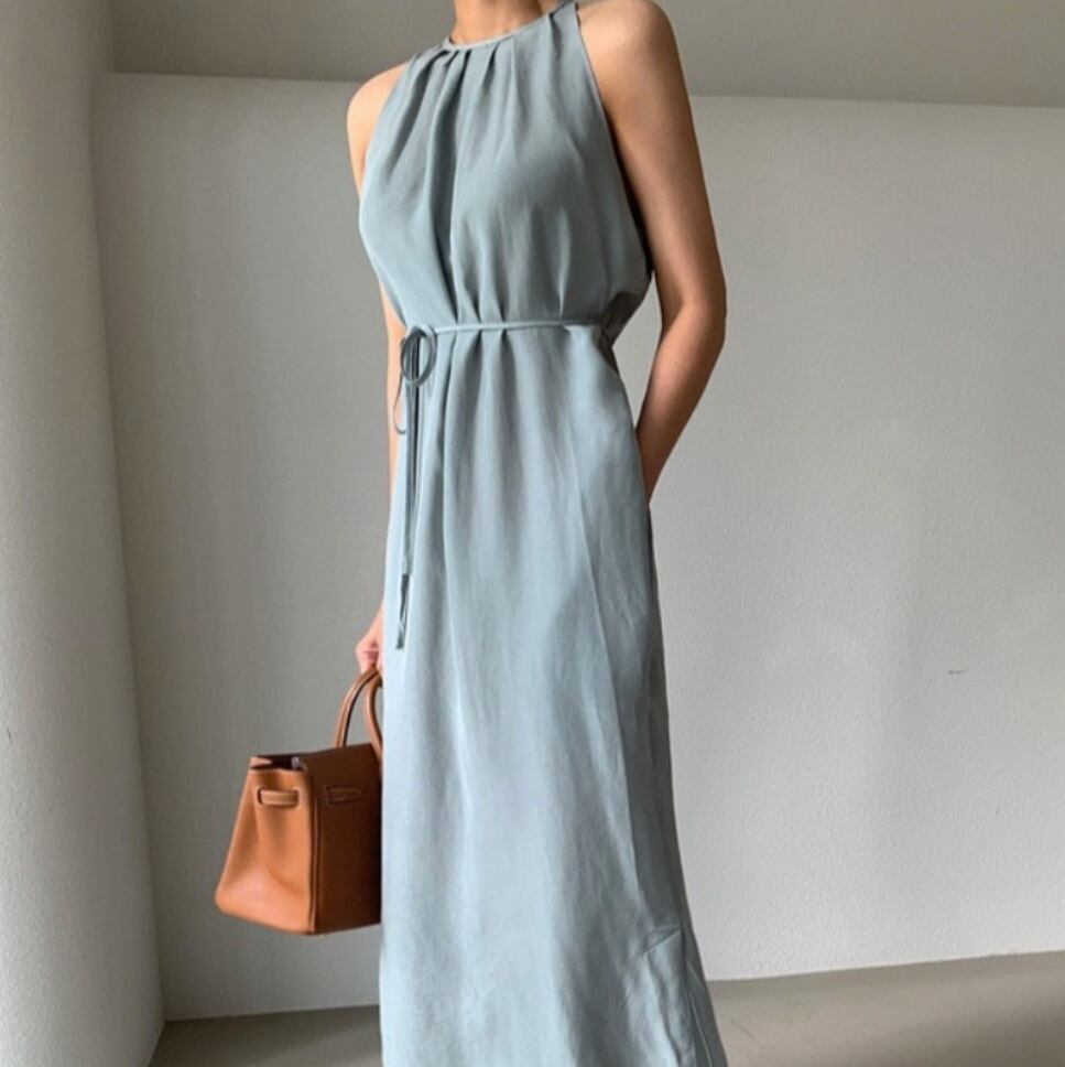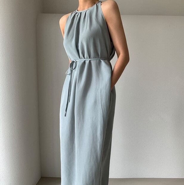 【送料無料】 ホルターネックドレス ホルターネックワンピース ウエストリボン 2way 韓国 レディース オルチャン リゾートワンピ 黒 ブラック 水色 ブルー フレアワンピース 袖なし ノースリーブ Uネック ラウンドネック セミフレア ストレート ウエストマーク サイドスリット ハイウエスト かわいい 大人可愛い きれいめ シンプル カジュアル 上品 おしゃれ かっこいい 抜け感 無地 夏 休日 イベント 旅行 海 カフェ ビーチ 美脚 脚長 トレンド 流行 インスタ映え フリーサイズ